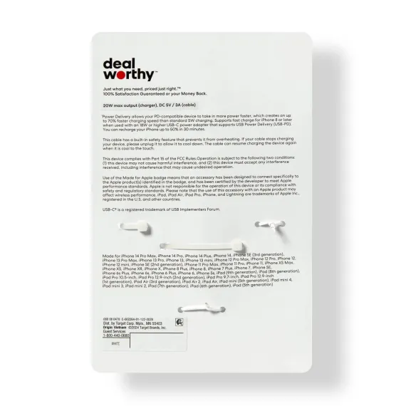 This Single Port 20W USB-C Home Charger with 3' Lightning to USB-C Cable - dealworthy™ White, is perfect for charging your Apple devices that have a Lightning port. Compatible with iPhone 14 and older models and select iPads, this USB-C to Lightning charging kit features a 3-foot cable for flexible charging along with an adapter head. This charger also comes with a built-in safety feature that prevents it from overheating.