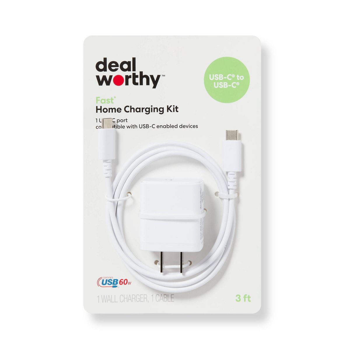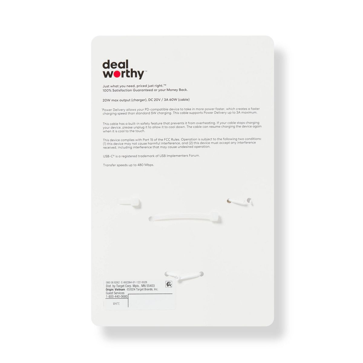 Single Port 20W USB-C Home Charger with 3' USB-C to USB-C Cable - dealworthy™ White: Wall Adapter & Cable