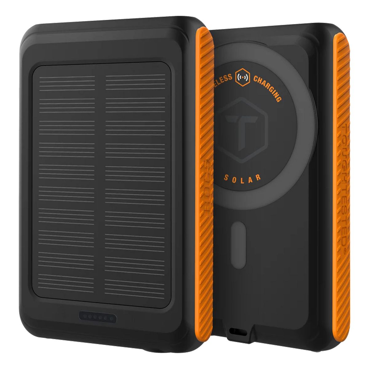 The ToughTested® ROC 5 Solar Power Bank is the ultimate charging solution for outdoor enthusiasts, professionals, and travelers who need dependable power in rugged environments. Built with a robust 5,000-mAh battery capacity and MagSafe® compatibility, this power bank securely attaches to iPhone® models 13 and newer, delivering seamless wireless charging on the go. Designed with our signature durability, it is IP54 rated, providing reliable water- and dust-resistance to withstand tough conditions on camping trips, hikes, and job sites. This power bank includes USB-C® Power Delivery (PD 20W) and Quick Charge 3.0 technology, providing rapid charging for compatible devices, including Android™ smartphones, tablets, GPS units, and other USB-powered devices, ensuring universal compatibility and speed.