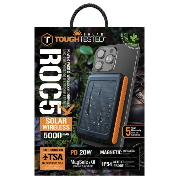 The ToughTested® ROC 5 Solar Power Bank is the ultimate charging solution for outdoor enthusiasts, professionals, and travelers who need dependable power in rugged environments. Built with a robust 5,000-mAh battery capacity and MagSafe® compatibility, this power bank securely attaches to iPhone® models 13 and newer, delivering seamless wireless charging on the go. Designed with our signature durability, it is IP54 rated, providing reliable water- and dust-resistance to withstand tough conditions on camping trips, hikes, and job sites. This power bank includes USB-C® Power Delivery (PD 20W) and Quick Charge 3.0 technology, providing rapid charging for compatible devices, including Android™ smartphones, tablets, GPS units, and other USB-powered devices, ensuring universal compatibility and speed.