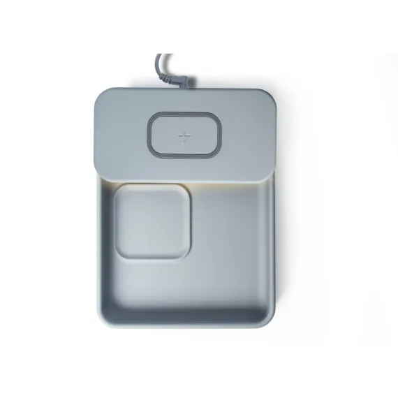 The Tylt Tray Pivot is a wireless charger and a vanity tray. The wireless charger can fast charge your devices up to 10W. You can also charge your headsets simultaneously in the dedicated peripheral charging zone. The Tray has a generous space for holding your keys, wallet, coins, etc. The mobile phone charging platform can pivot to expose more storage space, maximizing the usable storage area. The Tray Pivot can charge through most cases and covers. A power supply is included with a 5-foot cord.