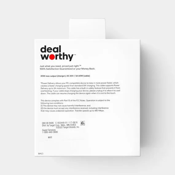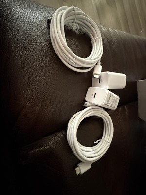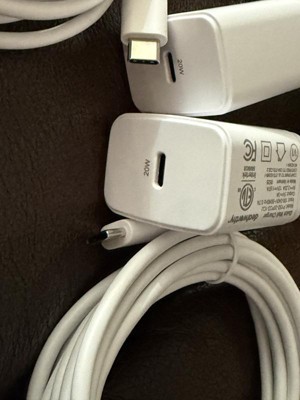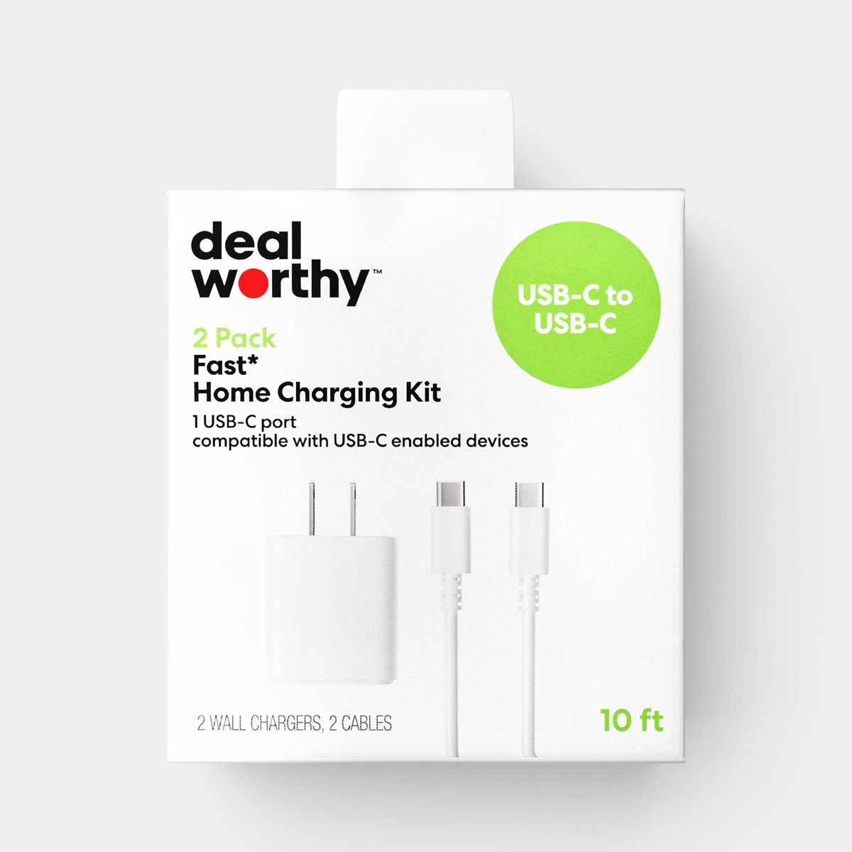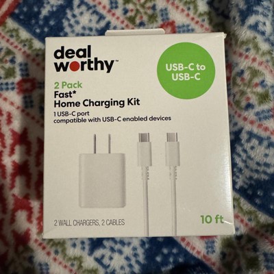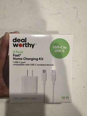 The USB-C Wall Charger with 10ft USB-C to USB-C Cable 2 Pack Home Charging Kit from dealworthy™ in White offers efficient charging with a 20-watt output and 12-volt output voltage. It includes two USB-C cables and wall adapters, providing short circuit and surge protection. The 10-foot cable length ensures flexibility and convenience. Compatible with Android, Apple iPhone and select iPads, this kit is ready to use for quick charging needs.