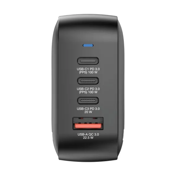 The Vertbatim® 100-Watt Mini GaN Charger combines 3 USB-C® and 1 USB-A port into a compact, pocket-sized design. Capable of charging up to 4 devices simultaneously, the USB-C® ports support PD 3.0 (Power Delivery) at 100 watts, with 1 supporting PD 3.0 at 20 watts, while the USB-A port supports QC 3.0. This mini GaN charger features an advanced chipset that allows for an even more compact design than regular GaN chargers without sacrificing power. This innovative technology not only reduces the charger's size but also minimizes heat generation, delivering safer and more efficient charging in a portable form factor. This charger supports USB Power Delivery 3.0, PPS, and Quick Charge 3.0, 4, and 4+ standards. The compact design of this charger includes foldable US prongs, and replaceable EU and UK plugs, making it ideal for the office, home, or traveling to power your laptop, tablet, smartphone, gaming devices, and more. Built from flame-resistant polycarbonate, the 100-Watt Mini GaN Charger comes in eco-friendly packaging with a 1-year warranty.