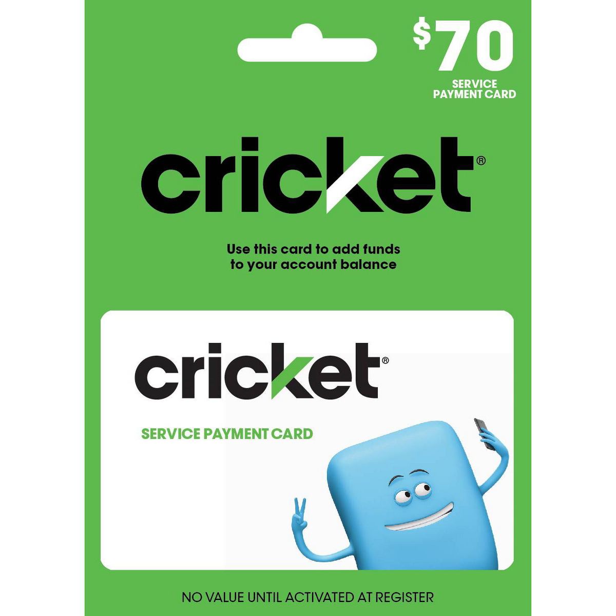 This card may only be used to add value to the Cricket Wireless account associated with your phone number. By purchasing, redeeming, or using this card you agree to the Cricket Wireless Terms and Conditions of Service available at cricketwireless.com/terms – including your agreement to dispute resolution by binding individual arbitration instead of jury trials or class actions. The entire value of this card will be applied to the charges, taxes, and fees of the Cricket Wireless account associated with your phone number during the activation process. There is no refund once this card’s value is applied to your Cricket Wireless account and Cricket does not provide or accept refunds of this card. This card is one-time use. The value associated with this PIN number and your Cricket Wireless account balance are nonrefundable, nontransferable, and cannot be exchanged for cash or any cash equivalent. Cricket is not responsible for lost, stolen, or damaged cards or PINs. Services and features are available for 30 days upon payment of the rate plan charge. Coverage, services, and speeds are not available everywhere. Cricket rate plans that include a high-speed data access allowance will have speeds slowed to a maximum 128Kbps for the remainder of the billing cycle after the allowance is used. For current network performance info and for network practices, please visit cricketwireless.com/mobilebroadband. Current rates, coverage areas, and other important information regarding your Cricket Wireless service are available by visiting cricketwireless.com, a Cricket retailer, or by calling Customer Care at 1-800-CRICKET. © 2024 Cricket Wireless LLC. All rights reserved. Cricket and the Cricket logo are registered trademarks under license to Cricket Wireless LLC.