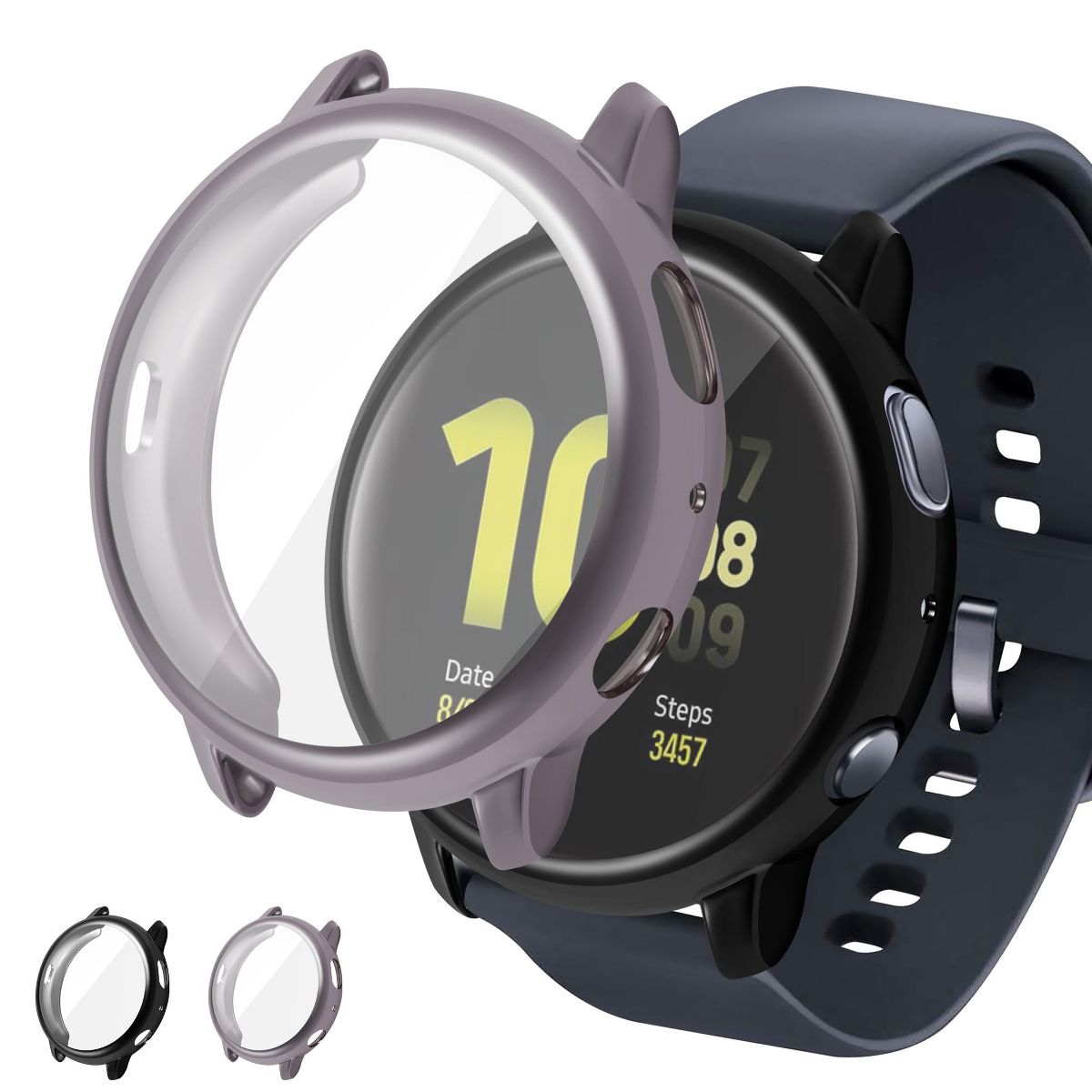 Compatible With Samsung Galaxy Watch Active 2 44mm Surround defense bumper case compatible Samsung Active 2 44mm covers watch on all sides. It absorbs shock to minimize impact for the inevitable times of accidental knock or drop. Perfect for protecting your smartwatch during high-powered activity such as sports, while also suitable for daily use. Built-in screen protector prevents scratches, fingerprints, and dirt. It provides excellent defense without obstructing functions. Screen remains highly touch-sensitive while providing the clearest possible HD view of your screen. Enjoy convenient charging without having to remove the case. Precise cutouts provide access all buttons easily. One-snap installation allows for direct attachment without removing wrist bands. Extremely lightweight without the added weight. * Package includes: 2 x TPU case with screen protector * Color: Black / Gray * Note: This item is just a case with screen protector. Watch is not included.
