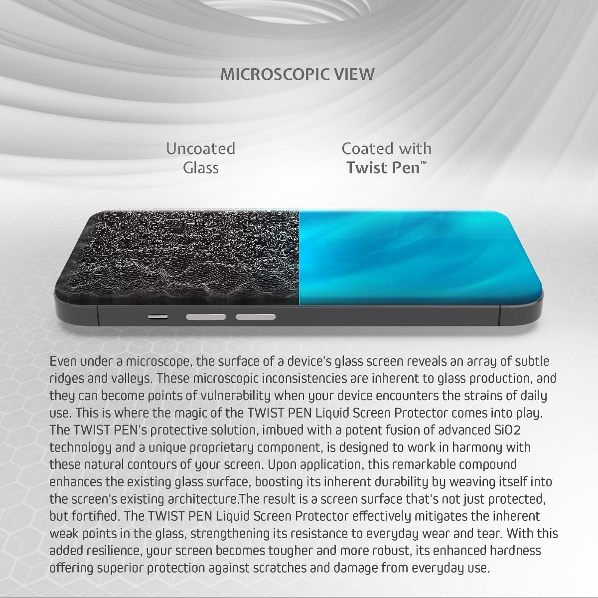 Introducing the new, patented TWIST PEN Liquid Screen Protector, an innovative breakthrough in the realm of device safety. At the heart of this new revolutionary protector lies a pioneering fusion of advanced SiO2 technology and a unique, proprietary component. This powerful combination, like a secret formula, transcends conventional standards, unlocking an unparalleled level of strength, durability, scratch and crack resistance, providing a protective shield like no other. This innovative TWIST PEN design simplifies the application process to just twist, glide, and protect. The efficient design ensures a flawlessly smooth, bubble-free application, culminating in an almost imperceptible, microscopic shield that embraces every inch of your screen. The protective solution, supercharged with silicon dioxide nanoparticles and our exclusive additional component, seamlessly bonds to your screen, forming a fortress against scratches, cracks, and the strains of everyday use. Adding to the TWIST PEN Liquid Glass Screen Protector's advantages is its impressive coverage capacity. With the ability to protect up to 10 devices, it stands as a cost-effective solution for tech aficionados or multi-device households. To further enhance the protection process, each TWIST PEN comes bundled with a high-quality screen cleaner spray. This aids in preparing your device for the optimal adherence of the advanced protective solution, ensuring a pristine and flawless application. Unlike traditional tempered glass protectors, our TWIST PEN design eliminates the struggle with alignment, bubbles, and dust particles. It simplifies the application process to just twist, glide, and protect, ensuring a flawlessly smooth, bubble-free application. This efficient design forms a microscopic, almost imperceptible shield that extends across every inch of your screen, offering comprehensive coverage and superior protection. Step into the new era of screen protection with the TWIST PEN Liquid Glass Screen Protector. More than just a product, it's a revolutionary shift in device safety, offering unparalleled protection and extraordinary ease of use. Welcome to a new dawn in screen protection, where advanced technology and convenience converge to create the ultimate protective shield for your device.