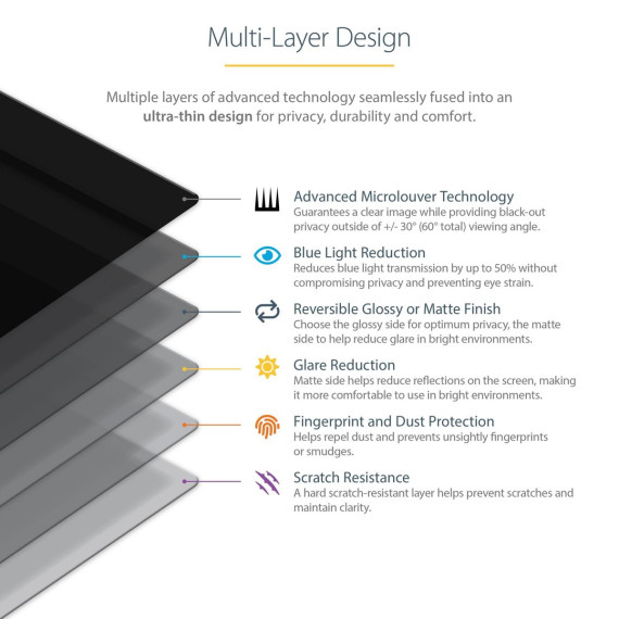 The privacy screen protector for desktop monitors is a great investment if you want to protect your privacy. It is a convenient and cost-effective way to keep your classified information, intellectual property or any other important data you wish to keep protected. You can have a peace of mind while working in the office or public environments because you know your screen is protected with the 30+/- degree privacy viewing angle. The cutout on the top corner of the privacy screen makes it easy to remove for sharing content with trusted audiences or switching between finishes.
