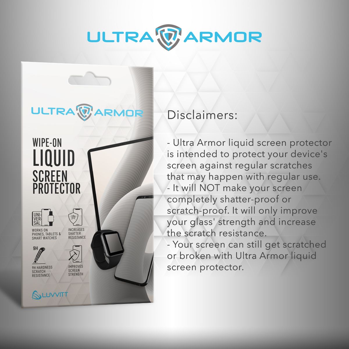 ULTRA ARMOR Liquid Glass is a cutting-edge super durable, completely transparent liquid screen glass protector that bonds to the glass of your device offering greatly enhanced scratch, moisture, and impact resistance. It's made of silica dioxide (Si02) which is essentially microscopic particles of glass suspended in a liquid solution.Completely harmless and invisible once applied with easy wipe-on DIY application, ULTRA ARMOR fills in the imperfections of the screen and adds an additional layer of glass. It's extremely scratch & shatter resistant and it Increases the glass' strength to 9h hardness. ULTRA ARMOR Liquid glass screen protector is intended to protect your device's screen against regular scratches that may happen with regular use. It will NOT make your screen completely shatter-proof or scratch-proof. It will only improve your glass' strength and increase the scratch resistance. Your screen can still get scratched or broken with a liquid glass screen protector.