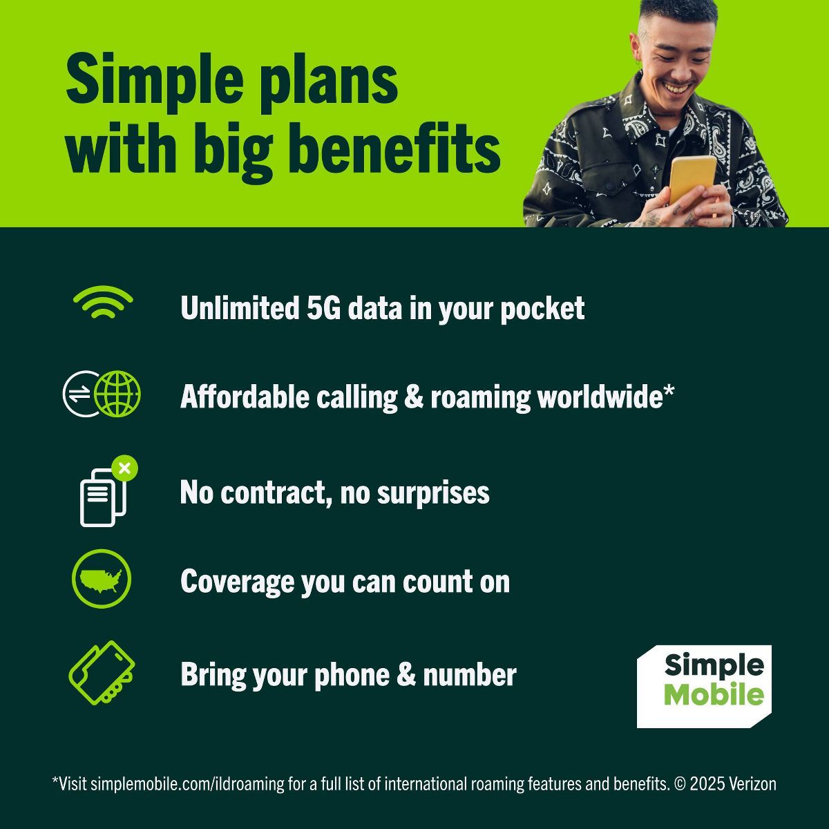 Use your unlocked compatible phone and pair it with an Unlimited talk, text & data plan from SIMPLE Mobile, and you’ll enjoy coverage on the lightning fast America's Most Reliable 5G Network.