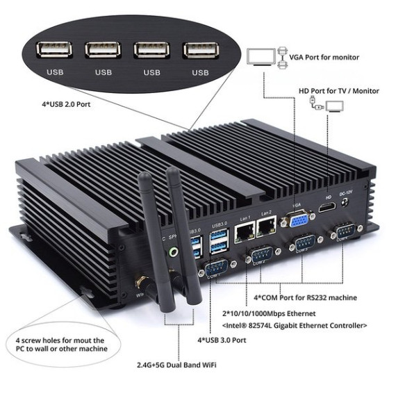 Kingdel Powerful Mini Desktop Computer, Fanless Industrial PC, Intel i5 Dual Core CPU, 8GB RAM, 128GB SSD, 2xNICs, 4xUSB 3.0, 4xCOM RS232, HDMI, Metal Case, Windows 10 Pro