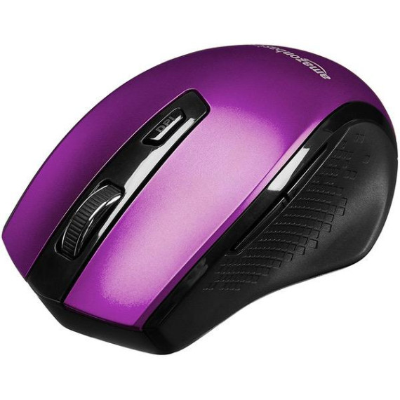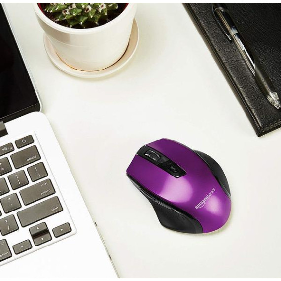 Make sure this fitsby entering your model number. Compact wireless mouse with adjustable DPI for preferred sensitivity (600, 1000, 1600, 2400, or 3600 DPI) Advanced optical sensor; works on most surfaces; clickable metallic scroll wheel; back/forward thumb buttons for easily navigating web pages 2.4 GHz wireless connection with a 33-foot range; uses AES-128 encryption for added security; this mouse uses a small USB receiver that can stay plugged into your computer without obstructing other ports Ergonomic shape with rubberized sides ensures a comfortable hold; compatible with Windows 7, 8, and 10; uses 1 AA battery (included); pretty Purple color Measures 4.1 by 2.9 by 1.5 inches; backed by an AmazonBasics 1-year limited warranty