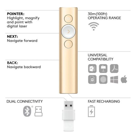 Make sure this fitsby entering your model number. Advanced Highlighting* – The Logitech Spotlight remote allows you to highlight or magnify on screen. Visible to audience in-person and video conference. It also has a mouse-like cursor control for you to interact with your content (videos, links, etc). *Requires installation of Logitech Presentation software (available for download at logitech.com). Smart Time Management* – Manage your time perfectly from your first until your final slide. Set timed milestones within the app and receive vibration alerts directly to hand. *Requires installation of Logitech Presentation software (available for download at logitech.com). Universal Compatibility – The Logitech Spotlight remote is optimised to work with Windows or macOS as well as leading presentation software including PowerPoint, Keynote, PDF, Google Slides and Prezi. Dual Connectivity – Connect the Logitech Spotlight remote to your computer via USB receiver or low energy Bluetooth. A convenient, built-in dock stores the USB receiver inside the remote when not in use. 30 Meters Operating Range* – Move and present freely from as far as 30 metres away. Perfect for medium to large-size rooms. *May vary based on use and computing conditions.