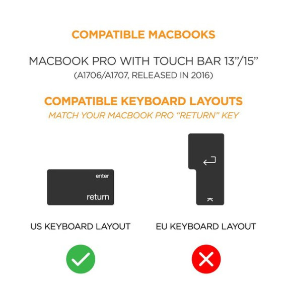 Engineered to fit precisely to the keyboard of your 2016 2017 2018 2019 Macbook Pro with Touch Bar (Apple Model Number A1706, A1707, A1989, A1990) US Keyboard Layout Only