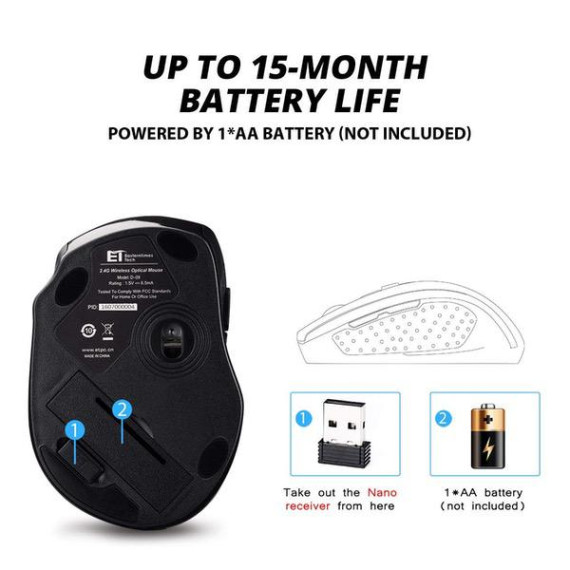 Make sure this fits by entering your model number. 5 ADJUSTABLE CPI & 2 POLLING RATE. 800,1200,1600,2000,2400, easily change the cursor sensitivity depending on your activity. 2 polling rate: 125Hz and 250Hz. Comes with a Nano receiver (stored in the back of the mouse). No need any driver, plug and play directly. STRONG DURABILITY & LONG WORKING DISTANCE. Passed 5,000,000 times keystroke test to guarantee extra durability. 2.4GHz wireless technology and professional gaming chip (PAW3212) ensure longer working distance, reaching up to 33ft. MAXIMUM HAND-FEELING. Contoured shape, sweat-resistant and skin-friendly finish are for maximum comfort and support. The thoughtful ring and little finger rest provide extra comfort. The sturdy scroll wheel with rubber makes sure that your hand will not slip when scrolling. EXTREMELY LOW POWER CONSUMPTION. This wireless computer mouse will be in sleep mode in 8 minutes of inactivity. Press any button to wake it up. Note: powered by 1*AA battery (not included). WIDE COMPATIBILITY. Well compatible with Windows7/8/10/XP, Vista7/8 and Linux etc. Fits for desktop, laptop, PC, Macbook and other devices. This gaming wireless mouse enjoys 45 days money-back and 12-month worry-free warranty.Notice,the side buttons are not available for Mac OS,but the other function can be used normally.