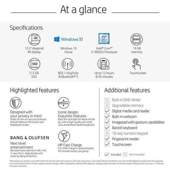 Make sure this fitsby entering your model number. CUTTING-EDGE SECURITY: State-of-the-art security features include Webcam Kill Switch and integrated fingerprint reader BIOS RECOVERY AND PROTECTION: Automatically checks the health of your PC, protects against unauthorized access, secures local storage and recovers itself from boot-up issues DISTINCTIVE DESIGN: High-quality, durable, all-metal case built to last, with premium design features including a brilliant backlit keyboard and geometric pattern speaker grill SUPER FAST PROCESSOR: 8th Generation Intel(R) CoreTM i7-8565U, Dual Core, 1.8GHZ UP TO 4.6GHZ 4K DISPLAY: 13.3-inch diagonal 4K IPS micro-edge WLED-backlit touchscreen with Corning(R) Gorilla(R) Glass NBT(TM) (3840 x 2160) MEMORY AND HARD DRIVE: 16 GB DDR4-2400 SDRAM (not upgradable), 512 GB PCIe(R) NVMeTM M.2 Solid State Drive BATTERY LIFE: Up to 12 hours and 45 minutes (mixed usage), up to 9 hours and 45 minutes (video playback), up to 5 hours and 45 minutes (wireless streaming)