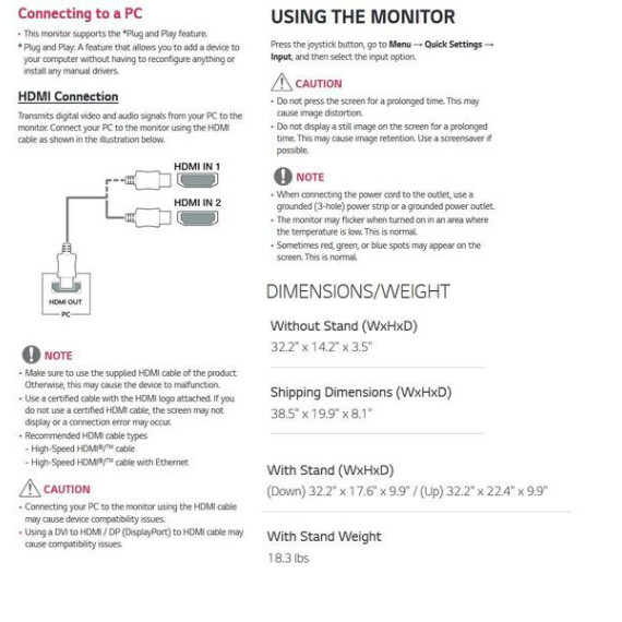 Make sure this fitsby entering your model number. 21:9 UltraWide Curved QHD IPS Monitor sRGB over 99%/Color Calibrated USB 3.0 Quick Charge Height/Tilt Adjustable Stand. Screen Split 2.0 (PIP Mode) HDMI 2.0. Color Depth (Number of Colors)-10bits (8bit+FRC), 1.07B. Brightness (cd/m2)-300 cd/m2 Mounting type: VESA Size (mm) 100 x 100 Without Stand (WidthxHeightxDepth)32.2inches x 14.2inches x 3.5inches and With Stand (WidthxHeightxDepth)- (Down) 32.2inches x 17.6inches x 9.9inches