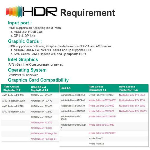 Great Monitor for the price this monitor works great the included dp cable sucks the screen flickers a lot at 1440p 165hz you may need to buy a dp cable. gsync works,for hdr you have to go to the menu and enable it but its not worth using the image looks horrible. pros 1440p 165hz looks amazing. gsync works. cons dp port cable sucks you may need to buy a vesa certified dp cable. Hdr sucks. for the price the monitor its really good.