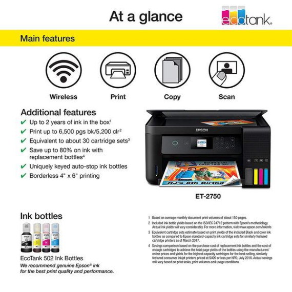 I have been closely following & researching the Ecotank printers right from their initial launch in 2015,. They are now in their third generation with the latest lineup of Expression home inkjets (ET2700, ET2750 & ET3000) which means that they are more widely in circulation and gives a good idea of the good and issues of the previous generations , but it also gives Epson the chance to fix them . For this review of the ET-2750 I wanted to cover all important aspects thoroughly hence it is going to be lengthy , So please bear with me and you can skip to the relevant section if youd like: WHATS NEW IN THE 3rd Gen ECOTANK PRINTERS - The new printers are much more compact and smaller in size as the ink supertanks are now moved from the side as in the previous models to the front. The new ink tank design looks much better integrated on the printer instead of a weird looking bolt-on on the sides - Much more improved Wifi stability : Theyve addressed one of the most common complaints of the previous generation and greatly improved wifi connectivity. I left my printer turned on for an entire week and every time I wanted to use the printer/scanner from my computer it woke from sleep and responded reliably . In my other tests It always managed to connected to WiFi from the powered off state - Refilling the ink tanks is now foolproof with keyed auto-stop ink bottles so you cannot accidently fill a tank with the wrong colored ink . Refilling the ink tanks is easier with auto stop bottles and mess-free . I did not have to use gloves or paper towels (which Epson recommends btw) - Printhead reliability : While the issue to faulty or clogged printheads was not widespread but I am hoping improvements have been made in this area too. I will update this section over time , also check out my maintenance section below to keep your printer healthy and prevent the ink from drying ECOTANK & ITS COST EFFECTIVENESS - Inkjet printers have long been sold on the razor-blade model - Sell printers for cheap/at-loss and make money off the refills. The Ecotank printers turn that model on its head and sell the printers at profit at higher prices upfront and offer cheap environment-friendly ink. This surely beats out the hassle out having to replace ink cartridges frequently as they run out or dry up. But it also kind of makes sense for the manufacturer as well because (thanks to ink refills & remanufactured cartridges) the use of their original replacements isnt always guaranteed (which they count on to make profit) - Without getting into too much specifics, but considering the high upfront cost of this printer you can expect to break even in terms of costs after youve gone through the first ink bottle set and printed thousands of pages. Only after this you start saving money - A four bottle replacement ink set (Black, Cyan, Yellow, Magenta) sets you back by $62 and even then it is cheaper and gives you more than double the pages when compared to an HP Instant Ink plan INITIAL SETUP & SOFTWARE - The initial setup requires you to download the driver software from the internet (there is a note in the box saying "Stop! Download software from the internet ) even though there is a drivers CD included in the box - The setup process was simple and probably the most irritating part of it was having to input your WiFi password using up and down arrow keys to scroll letters on the tiny 1.44" display. Thankfully it is only a one time process - After the WiFi/driver setup process completes and the ink tanks filled, the printer then goes through a lengthy one-time priming process called Ink Charging to pull ink from the tanks into the tubes/printheads and remove bubbles. This takes about 15 mins to complete - Once the ink charging process completes it takes you through the printhead alignment process which requires you to evaluate two printed pages for vertical and horizontal print head alignment. This involves a very fine eye to evaluate the tiny differences between the samples and I got it wrong the first time. So if you see gaps or overlaps in your prints .then try running the alignment again. Overall it will take about 30-40 mins from the time you plug in and the first time you are able to use the printer - I was not very impressed with the software of the printer, it is functional but looks very dated (like Windows 95 UI) and it is also quite pervasive . It has two processes that are always running under Windows task manager and an icon in the Windows system tray. And even then certain functions (like print head alignment) can only be done on the printer only . It comes with a simple scan app called Epson Scan 2 as well. PRINT QUALITY - The overall print quality of the printer is very good , comparable to other standard inkjet printers with sharp inky-black text without banding and bright colors. It prints photos well (paper quality makes a huge difference here) although i would recommend cranking up the saturation of your photos a bit before printing . Ive included several pictures of text and color printouts at various quality settings and paper types - One thing I would like to stress on is that while the print quality is good, it is not as good as speciality photo printer and is comparable to other standard inkjet printers. Nothing earth shattering here, Its Raison DEtre is its ink tank... - The default print Standard setting is oriented more towards speed and produces washed out colors which is ok for basic document printing . The Standard-Vivid profile is better for graphic intensive prints - Considering that its an inkjet (where speed is inverse to quality) , the printer still prints at a good speed even at the Best print quality. No complaints here - This printer supports duplex (two-sided) printing and it works very well. It sucks back up the page after it prints the first side and flips it internally to print the other side without any issues - It also supports borderless prints - Works with Google Cloud print, Apple Ai