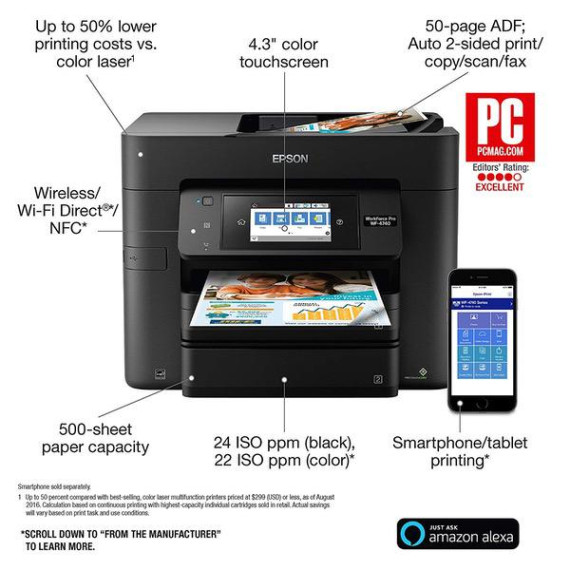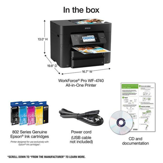 Make sure this fits by entering your model number. Get Performance Beyond Laser — the WorkForce Pro WF-4740, powered by PrecisionCore. Lightning fast color print speeds — fastest in its class (1); 24 ISO ppm (black) and 22 ISO ppm (color) (). Easy on the budget — up to 50 percent lower printing costs vs. color laser (2). Better quality than the lab. Worry-free handling. Convenient individual ink cartridges.