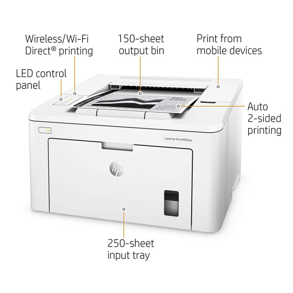 Make sure this fitsby entering your model number. Main functions of the HP M203dw laser printer: reliable monochrome printing, wireless printing, AirPrint, two-sided duplex printing, LED control panel, and more This HP M203dw laser printer replaces the HP M201dw printer, additionally the newer HP M203dw has 15% faster print speeds plus HP JetAdvantage Security Manager Prints up to 30 pages/minute, input tray paper capacity up to 260 sheets, duty cycle up to 2,000 pages/month Mobile printing: print from anywhere using your smartphone or tablet with the free HP ePrint app, easily print from your iPhone or iPad with AirPrint, send jobs from your devices to any company printer using Google Cloud Print, print without a network using Wi-Fi Direct printing Set a faster pace for your business: Print two-sided documents right away, and easily manage to help maximize efficiency Original HP Toner cartridges with JetIntelligence - engineered to help your printer print faster and more pages Choose Original HP 30A & HP 30X Toner cartridges specially designed to work with your printer and avoid frustrating reprints, wasted supplies, and delays. Save up to 35% with HP 30X high yield cartridge Ideal for home and small to medium businesses with work groups of 1-5 users. One-year limited hardware warranty; 24-hour, 7 days a week Web support