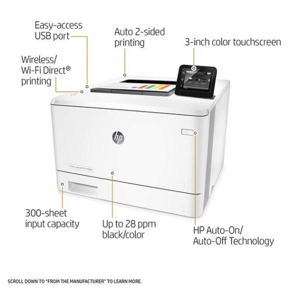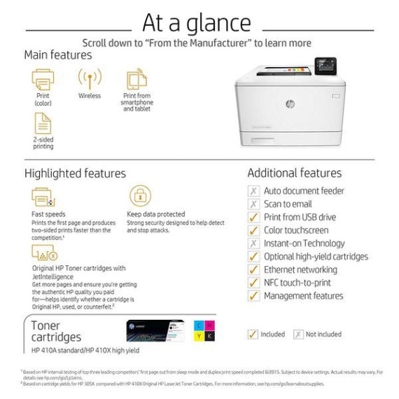 Make sure this fitsby entering your model number. FEATURES DESIGNED FOR YOUR BUSINESS: color laser printer, color touchscreen, wireless printing, 2-sided printing PRINT AT BUSINESS SPEED: Print up to 28 pages per minute with this wireless laser printer. First page out in as fast as 8.9 seconds for black, and 9.5 seconds for color. SOLID SECURITY: Protect sensitive information and improve compliance with data, device and document security solutions for your print fleet. HP JETINTELLIGENCE VALUE: Choose Original HP Toner cartridges with JetIntelligence - engineered to help your HP LaserJet printer print up to 40% faster and 33% more prints. IDEAL FOR SMALL BUSINESSES: 300-sheet paper input capacity, up to 4,000-page monthly volume, and up to 10 users for your workgroup. Paper sizes supported: Letter, legal, executive, Oficio (8.5 x 13 in), 3x5 in, 4x6 in, 5x8 in, envelopes (No 10, Monarch) Choose HP Original cartridges: Use Original HP 410A & HP 410X Toner cartridges specially designed to work with your printer and avoid frustrating reprints, wasted supplies, and delays. Warranty information: One-year warranty, return to HP Authorized Service Provider
