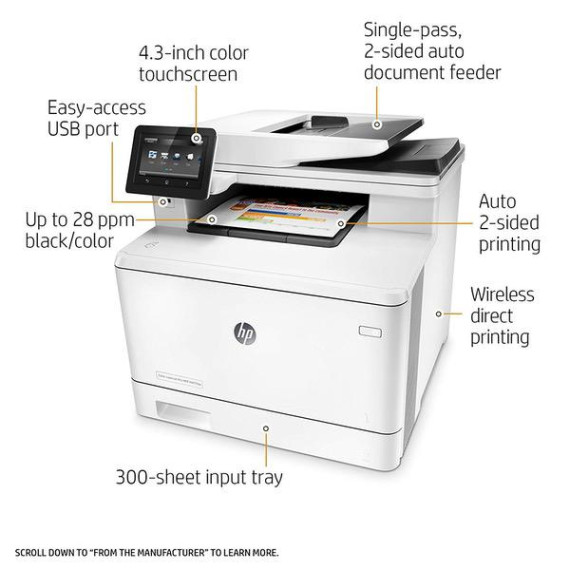 Make sure this fitsby entering your model number. MULTIFUNCTION LASER PRINTER: Color laser printer, scanner, copier, fax, wireless printing, Wi-Fi Direct, NFC touch-to-print, 4.3-inch color touchscreen, 50-sheet auto document feeder. PRINT AT BUSINESS SPEED: Print up to 28 pages per minute with this wireless laser printer. First page out in as fast as 8.9 seconds for black, and 9.8 seconds for color. SOLID SECURITY: Protect sensitive information and improve compliance with data, device and document security solutions for your print fleet. HP JETINTELLIGENCE VALUE: Choose Original HP Toner cartridges with JetIntelligence - engineered to help your HP LaserJet printer print faster and more prints. IDEAL FOR SMALL BUSINESSES: 300-sheet paper input capacity, up to 4,000-page monthly volume, and up to 10 users for your workgroup. Paper sizes supported: Letter, legal, executive, 3x5 in, 4x6 in, 5x8 in, envelopes (No 10, Monarch) NEVER SHOP FOR TONER AGAIN: Save 10% with Amazon Dash Replenishment. Upon activation your printer measures toner level and places smart reorders when you are running low. No subscription fees. Warranty information: One-year limited hardware warranty