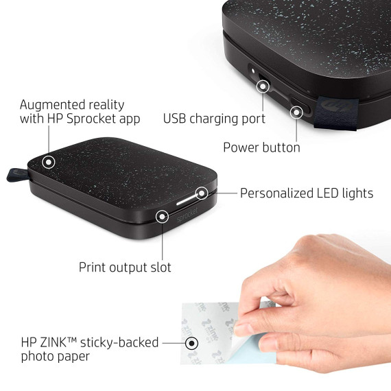 Make sure this fitsby entering your model number. INSTANT PHOTOS ON THE GO – Easily print your favorite adventures on 2x3" sticky-backed photo paper with this blush pink smartphone-sized photo printer that's designed to easily slip into your pocket, purse, or backpack GET THE PRINT PARTY STARTED – Now you can connect multiple devices so you and your friends can print at the same time – plus the personalized LED light shows you whose photo is printing! AUGMENTED REALITY FUN – Scan your Sprocket using your smartphone and the Sprocket app to view a virtual photo queue of print jobs and more as we continually add new features to the app SHARE THE MOMENTS – Share customized photo albums with friends using the HP Sprocket app and keep the fun going PERSONALIZE YOUR PRINTS – Decorate, design and print your social media photos with the HP Sprocket app so you can decorate your walls with your favorite photos ALWAYS CONNECTED – Now with Bluetooth 5.0 and sleep mode, HP Sprocket stays connected when not in use so it’s ready to print the moment you are, without draining your battery INCLUDES HP ZINK PHOTO PAPER – Load the 10 sheets of 2x3-inch paper into your pocket printer and create smudge-proof prints; this paper has peel-and-stick backing for instant photos or stickers WARRANTY - One-year limited hardware warranty
