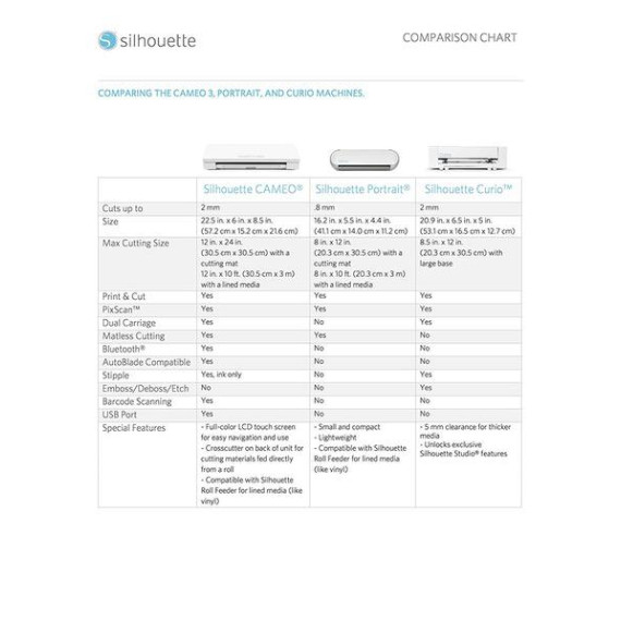 Make sure this fitsby entering your model number. Cuts a variety of material including vinyl, paper, cardstock, fabric, and other materials up to 12 inches wide and 10 feet long. Use the powerful Silhouette Studio design software to create your projects. Features Bluetooth technology for wireless cutting or plugs into your home computer. Features a dual-carriage for multi-tool use and a higher 2 mm clearance to cut thicker materials. Is compatible with Print & Cut and PixScan technology. Is the only Silhouette compatible with the self-adjusting AutoBlade. Includes Silhouette CAMEO cutting machine, Silhouette Studio software, power cable and USB cable, 12-Inch Cutting Mat, AutoBlade cutting blade