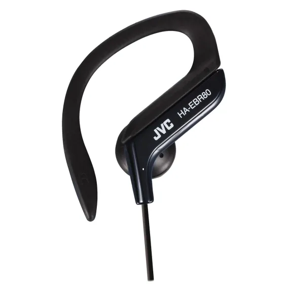 The JVC® HA-EBR80 Black Sport Ear Clip Headphones are an earbud design with a unique, adjustable ear clip that holds them securely in place. They are ideal for the active user and feature a 1-button remote control that makes it easy to operate the play, stop and skip functions, and answer a phone call that can be handled hands-free thanks to the built-in microphone. The headphones are compatible with Apple®, Android™, and Blackberry® devices. Designed for sports use, the HA-EBR80 headphones are both comfortable and practical. They fit snugly on the ear and are held in place by an adjustable soft rubber ear clip with 5 selectable positions for a secure and comfortable fit. To ensure high-quality sound reproduction, the headphones feature powerful 13.5-mm neodymium driver units, bass-boosting earpieces, and a friction noise-reduction cord of 3.94 ft. The HA-EBR80 headphones also come with a slim, gold-plated 3.5-mm plug.