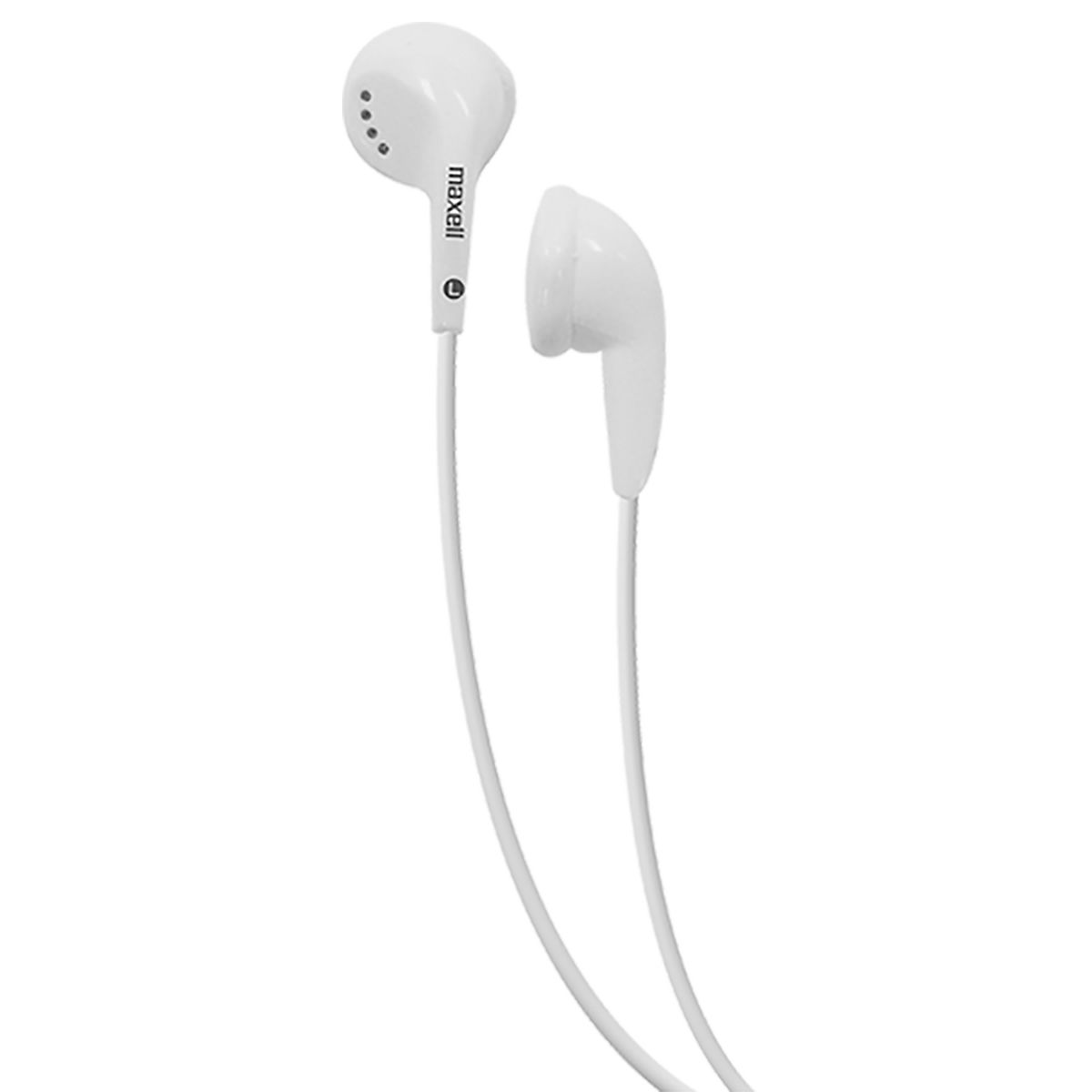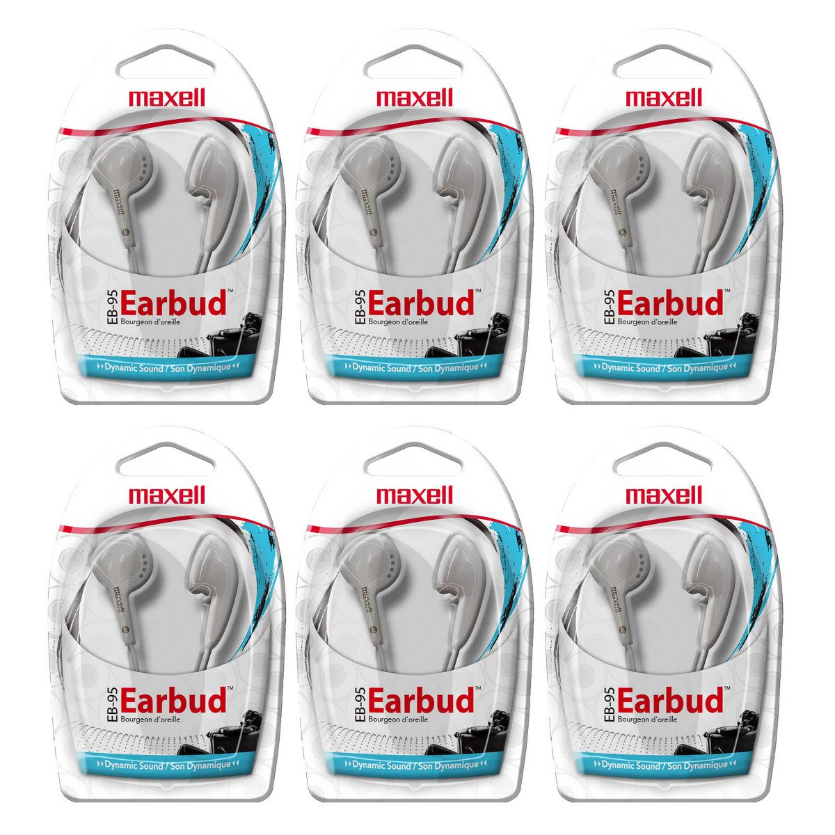 Maxell Budget Stereo Earbuds, White, Pack of 6 | These Maxell lightweight, stereo earbuds feature a one-piece molded plastic design. Featuring a wired connection with a 3.5mm straight plug plus a durable and flexible 4-foot cord. Ideal for everyday listening from numerous compatible sources. Sold as a pack of 6 identical earbuds. Suggested age range: 7 years and up.