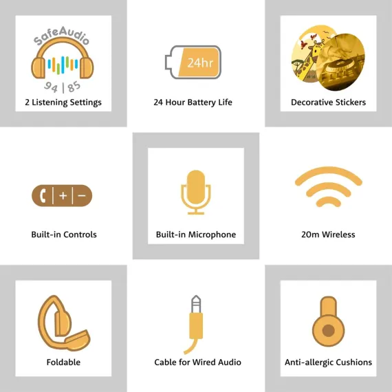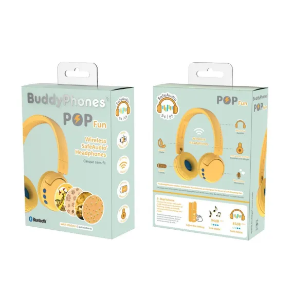 The BuddyPhones POP Fun is a safe wireless audio option for the next generation of bold pop culture creators. Specifically designed for young listeners, the POP Fun offers 2 safe listening modes in vibrant colors. It can be used with or without a cable and comes with a set of foil decals so users can express themselves through their headphones. SafeAudio protects hearing by limiting maximum volume to 85dB, or 94dB for noisier surroundings. Choose the appropriate safe listening mode based on the amount of listening time. When listening, simply press the two volume buttons to change modes.