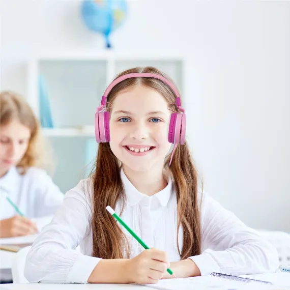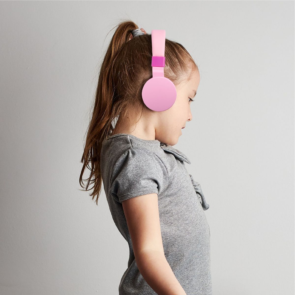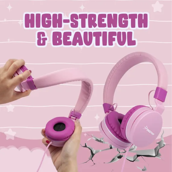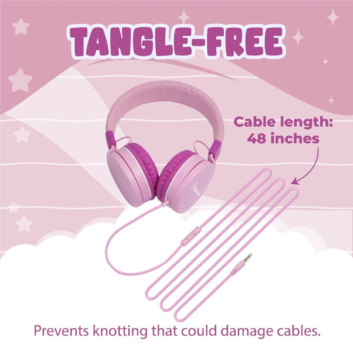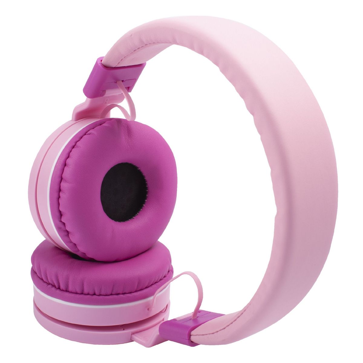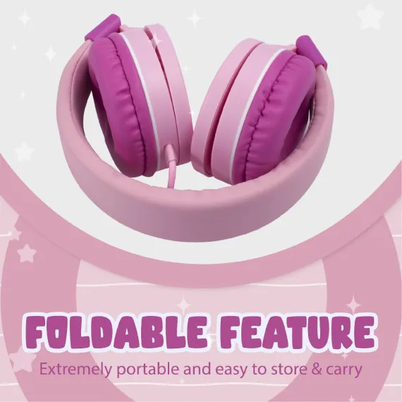 Get clear audio and excellent sound quality with our 40mm stereo bass headphones with microphone. Snug, lightweight, and comfortable, they are designed for kids ages 2–14. The 85dB volume limit ensures sound levels stay within a safe hearing range to protect against long exposure or auditory damage. Softly cushioned on-ear pads provide a gentle fit and noise isolation for an enhanced listening experience. The adjustable headband allows a secure, custom fit for different head sizes. A foldable design makes these headphones easy to carry and store, while the tangle-free cable prevents knots that could damage the cord. Built with high-strength, shatter-resistant materials, these headphones remain durable even after drops or bends. Compatible with devices featuring a 3.5mm audio port, including phones, PCs, laptops, tablets, portable music players, and gaming consoles. * Color: Pink * NOTE: This headphone does not have a remote, and volume control.