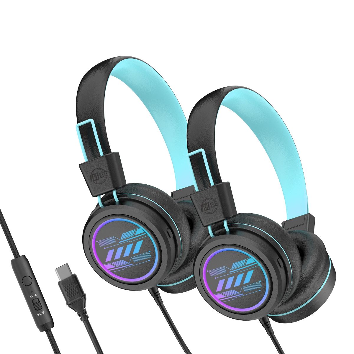 MEE audio KidJamz KJ55 Safe Listening USB-C Headphones for Kids with LED Lights (2 Pack, Blue)