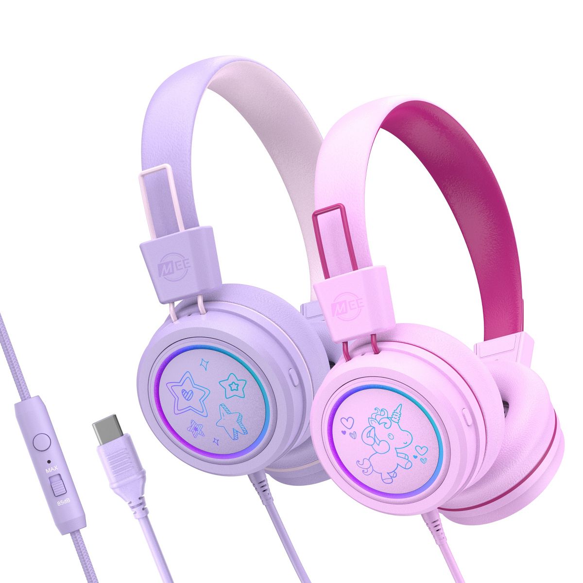 The MEE audio KidJamz KJ55U headphones are designed for kids, featuring volume-limiting technology to protect young ears and build healthier listening habits, while delivering clear, high-quality sound. These lightweight, durable headphones include soft, comfortable ear cushions and an adjustable headband for a secure fit. The built-in LED lights add a fun touch, making them perfect for travel, school, or everyday use. Safe, stylish, and kid-friendly, the KidJamz KJ55U makes listening both fun and safe. Perfect for your back to school shopping list, the KidJamz KJ55U are awesome go-to headphones with a USB Type C jack to use with laptops, Chromebooks, and other devices with USB-C connectors including iPhone 16 / 16 Pro / 15 / 15 Pro, iPad, and other smartphones/tablets.