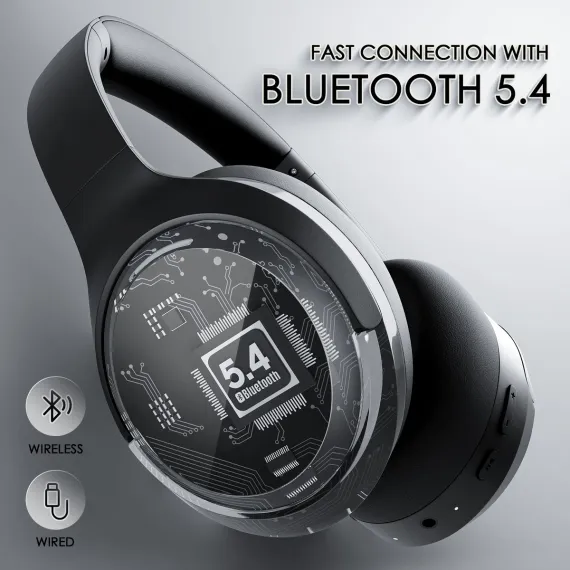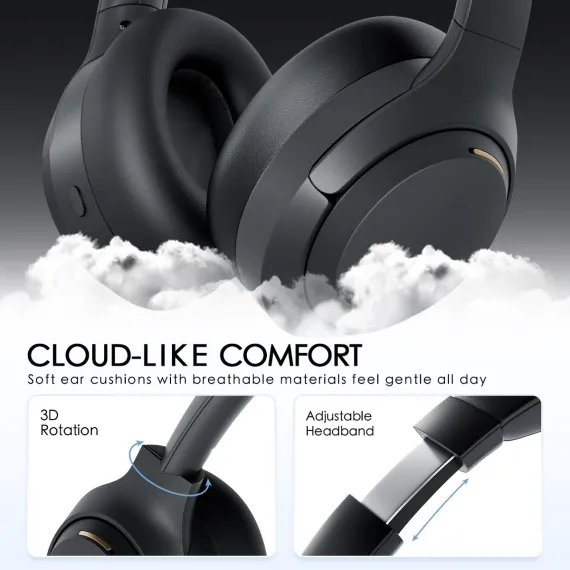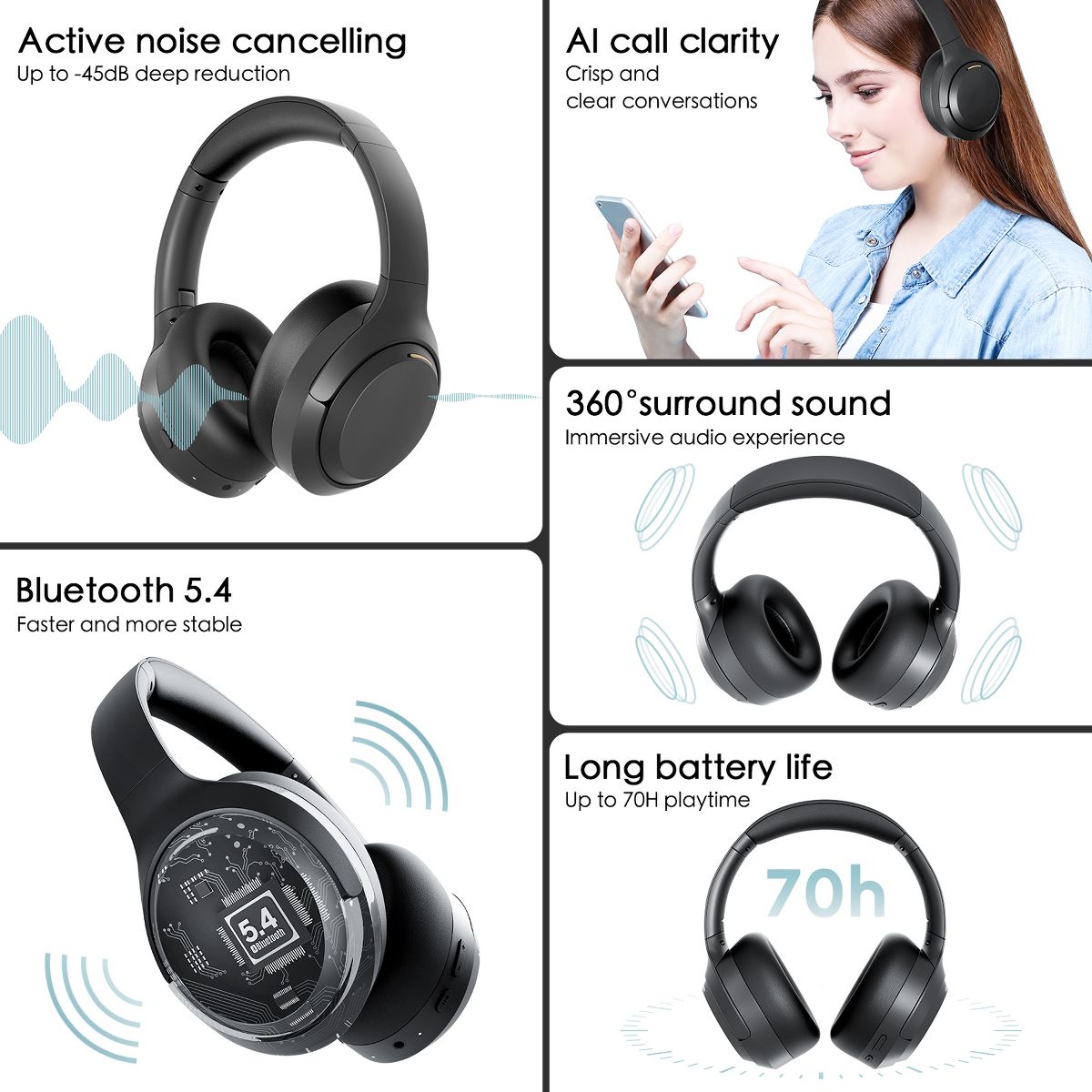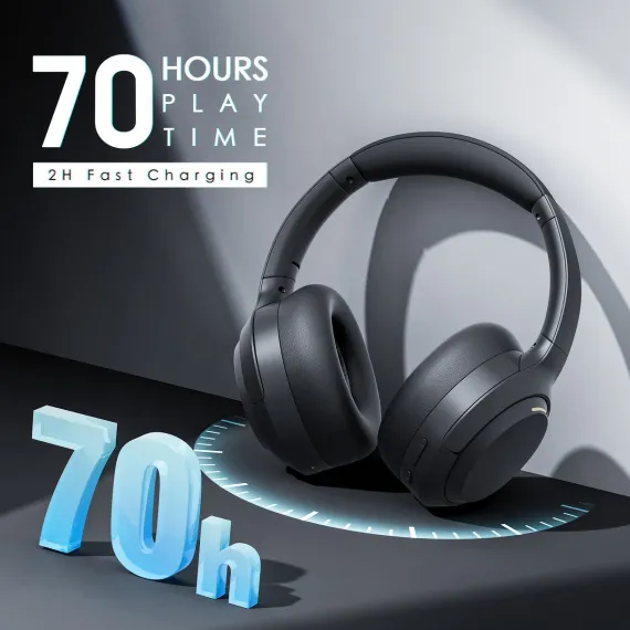 Immerse yourself in crystal-clear audio with these wireless headphones featuring –45 dB active noise cancellation to block out distractions on your commute or in busy offices. AI-driven mics enhance call clarity by filtering background noise, while 360° surround sound delivers deep bass and crisp highs. Enjoy up to 70 hours of playtime, fast 2-hour charging, and a secure Bluetooth 5.4 connection. Soft memory-foam cushions and an adjustable headband ensure all-day comfort.