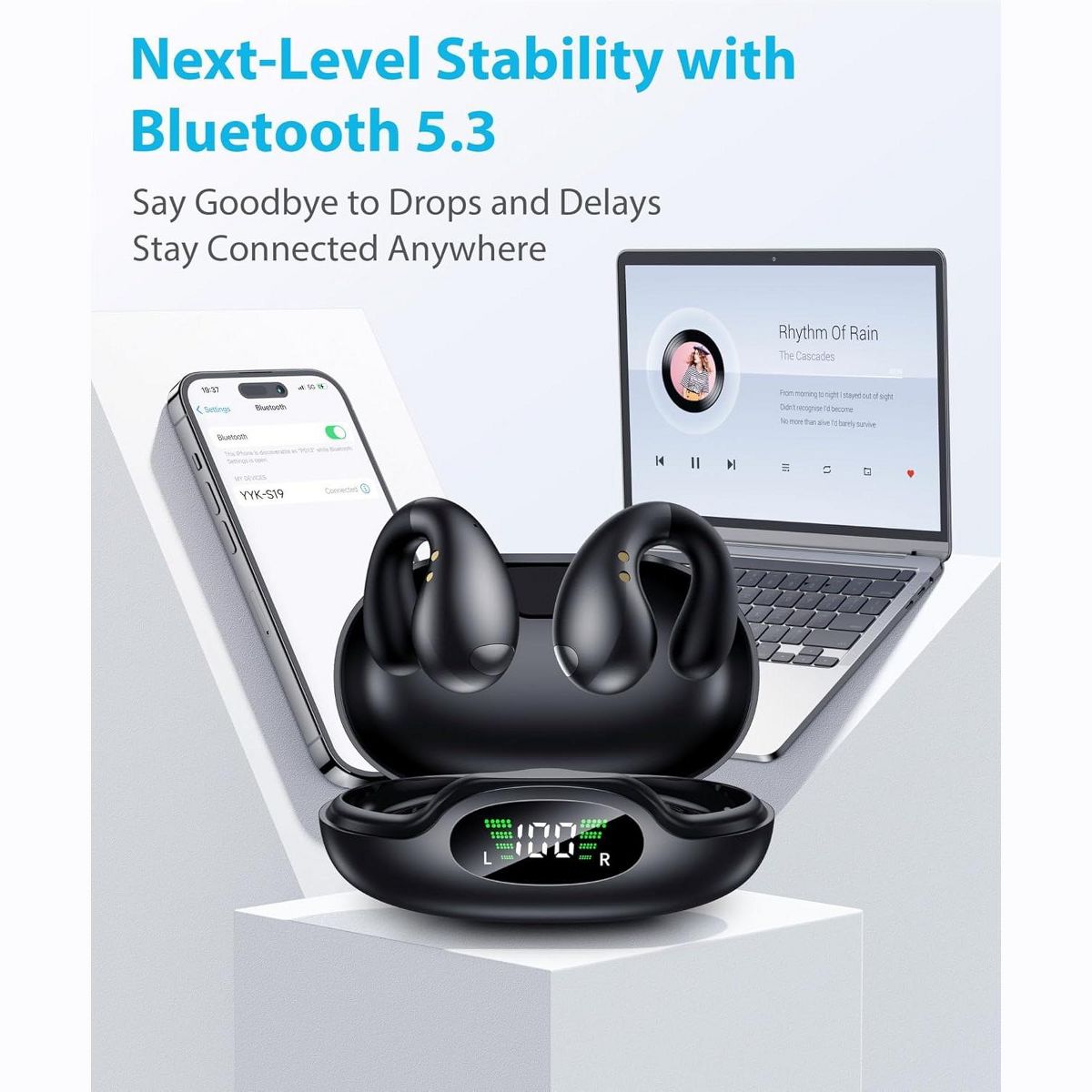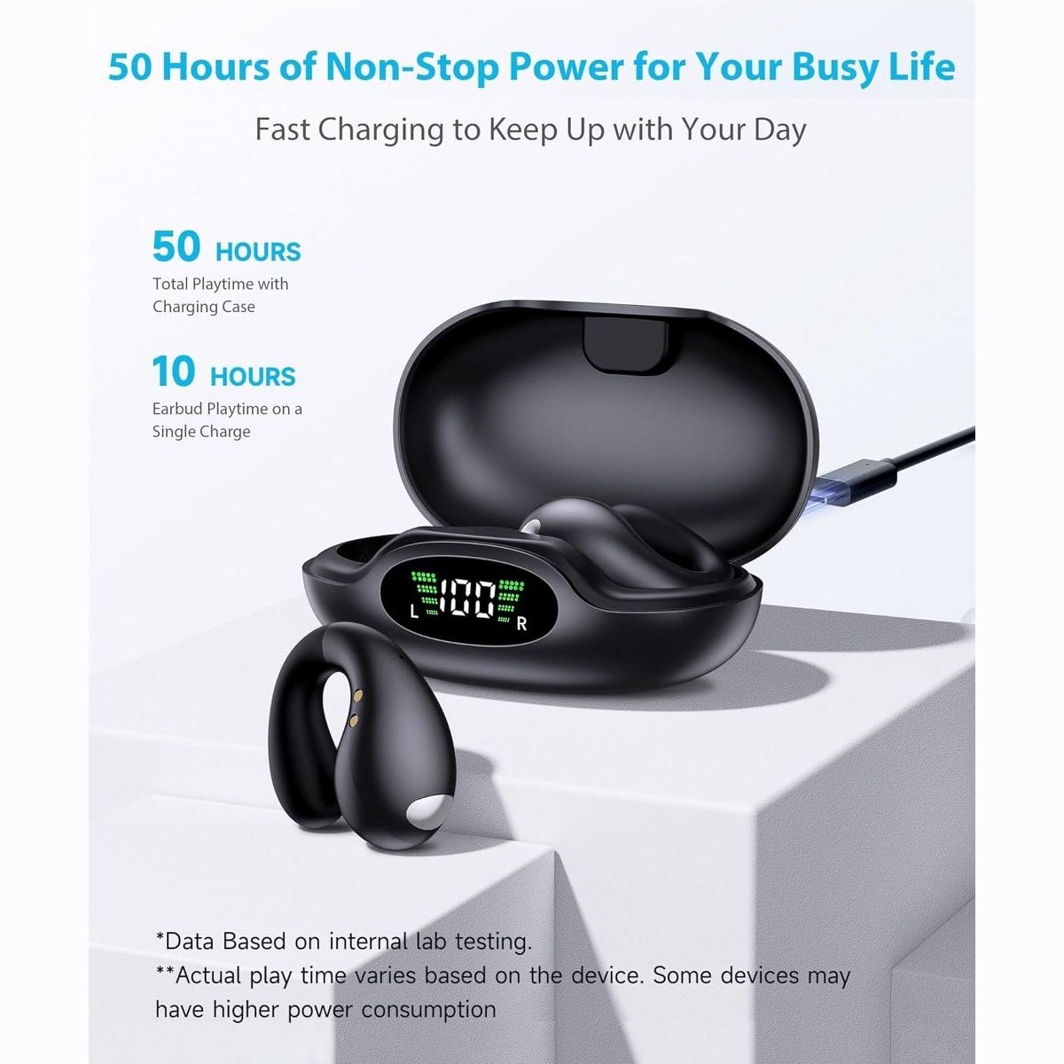 All-Day "Zero-Pressure" Wear: Featuring an ergonomic ear-clip design, these earbuds sit comfortably outside the ear canal. Say goodbye to ear fatigue and pressure, and enjoy a "breathable" listening experience that feels like wearing nothing at all. Total Awareness for Safer Travel: The open-ear design allows you to stay immersed in your music while remaining fully aware of traffic, conversations, or nature. It is the ideal choice for outdoor sports, daily commuting, and office multitasking. Powerful Sound & Crystal-Clear Calls: Equipped with massive 16.3mm dynamic drivers, these earbuds deliver a rich, immersive stereo soundstage. Advanced noise-reduction technology ensures every phone call is as clear and natural as a face-to-face conversation. Massive Battery Life, Zero Anxiety: Enjoy up to 50 hours of total playtime with the charging case. Never worry about low battery again—our fast-charging technology gives you 1 full hour of playback from just a quick 5-minute charge.