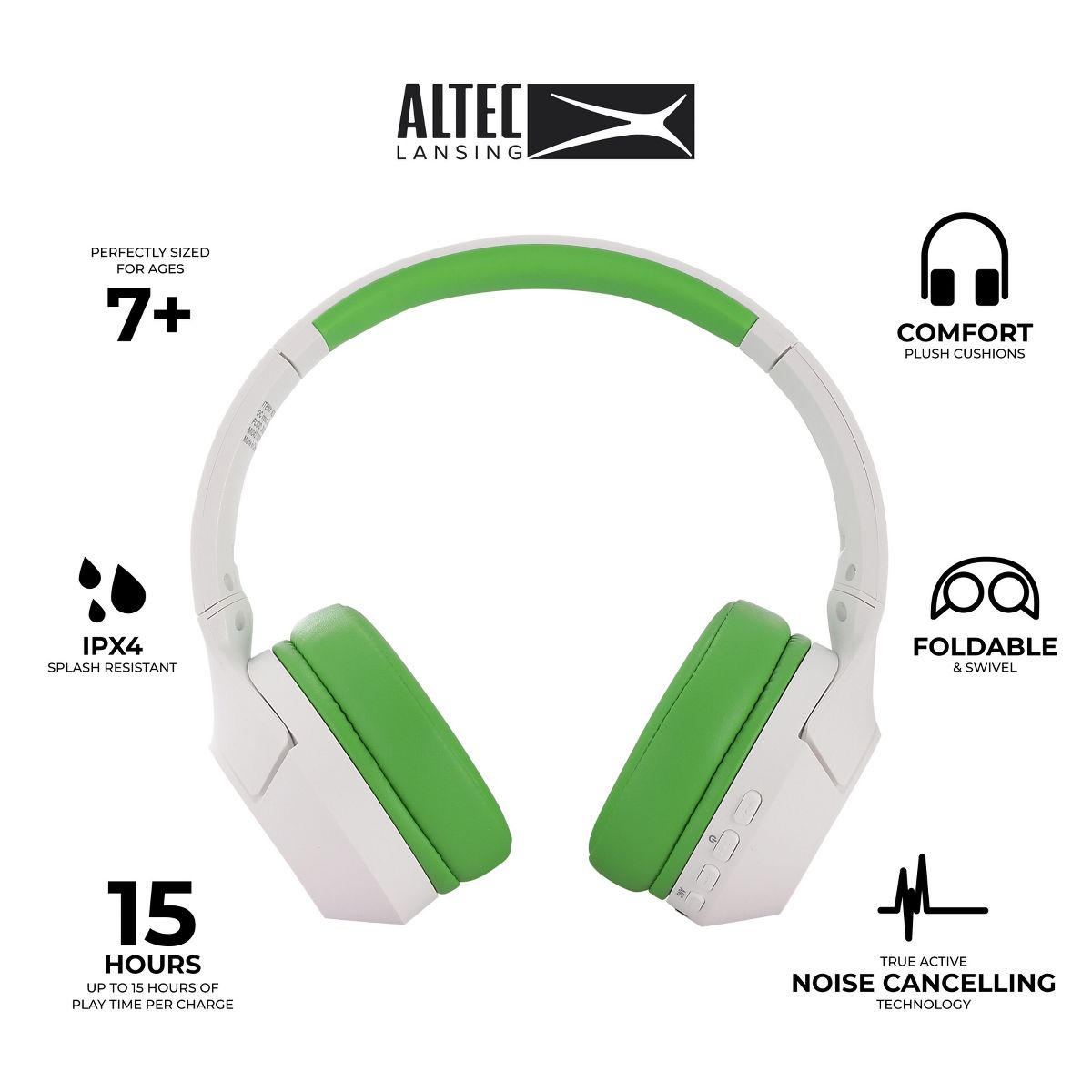 Experience the powerful Altec Lansing sound at a kid safe volume. With 85dB of volume-limiting technology, your child can listen to their favorite song or movie at a volume that will not affect their growing ears. Why Active Noise Cancelling? To block out loud surrounding noise while still maintaining a safe 85dB volume limit. 2 ways to listen with up to 15 hours of playtime per charge, and there’s enough battery life to bring your music anywhere. No charge left? Plug in the aux cable to listen without time limits. These headphones are designed with an IPX4 splash-resistant waterproof rating that protects against splashes and messes. Don’t fret the mess! These will easily wipe clean. Perfect for ages 7+ these headphones are ready to hit the ground running for all your child’s activities.