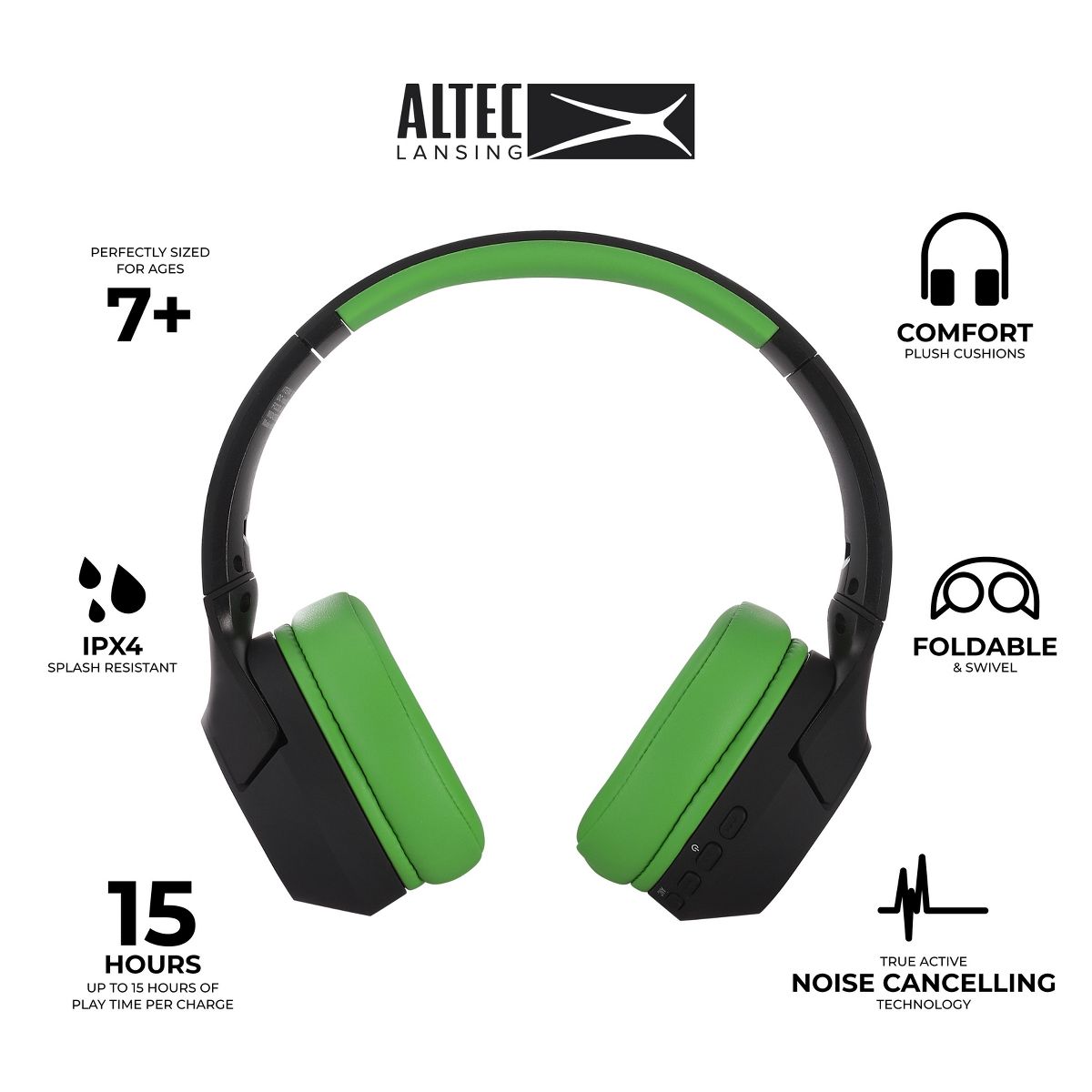 Experience the powerful Altec Lansing sound at a kid safe volume. With 85dB of volume-limiting technology, your child can listen to their favorite song or movie at a volume that will not affect their growing ears. Why Active Noise Cancelling? To block out loud surrounding noise while still maintaining a safe 85dB volume limit. 2 ways to listen with up to 15 hours of playtime per charge, and there’s enough battery life to bring your music anywhere. No charge left? Plug in the aux cable to listen without time limits. These headphones are designed with an IPX4 splash-resistant waterproof rating that protects against splashes and messes. Don’t fret the mess! These will easily wipe clean. Perfect for ages 7+ these headphones are ready to hit the ground running for all your child’s activities.