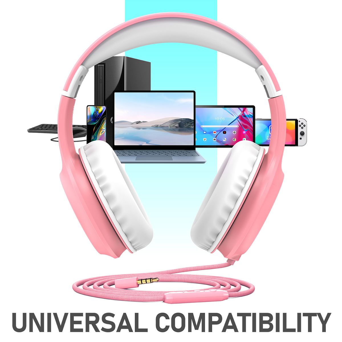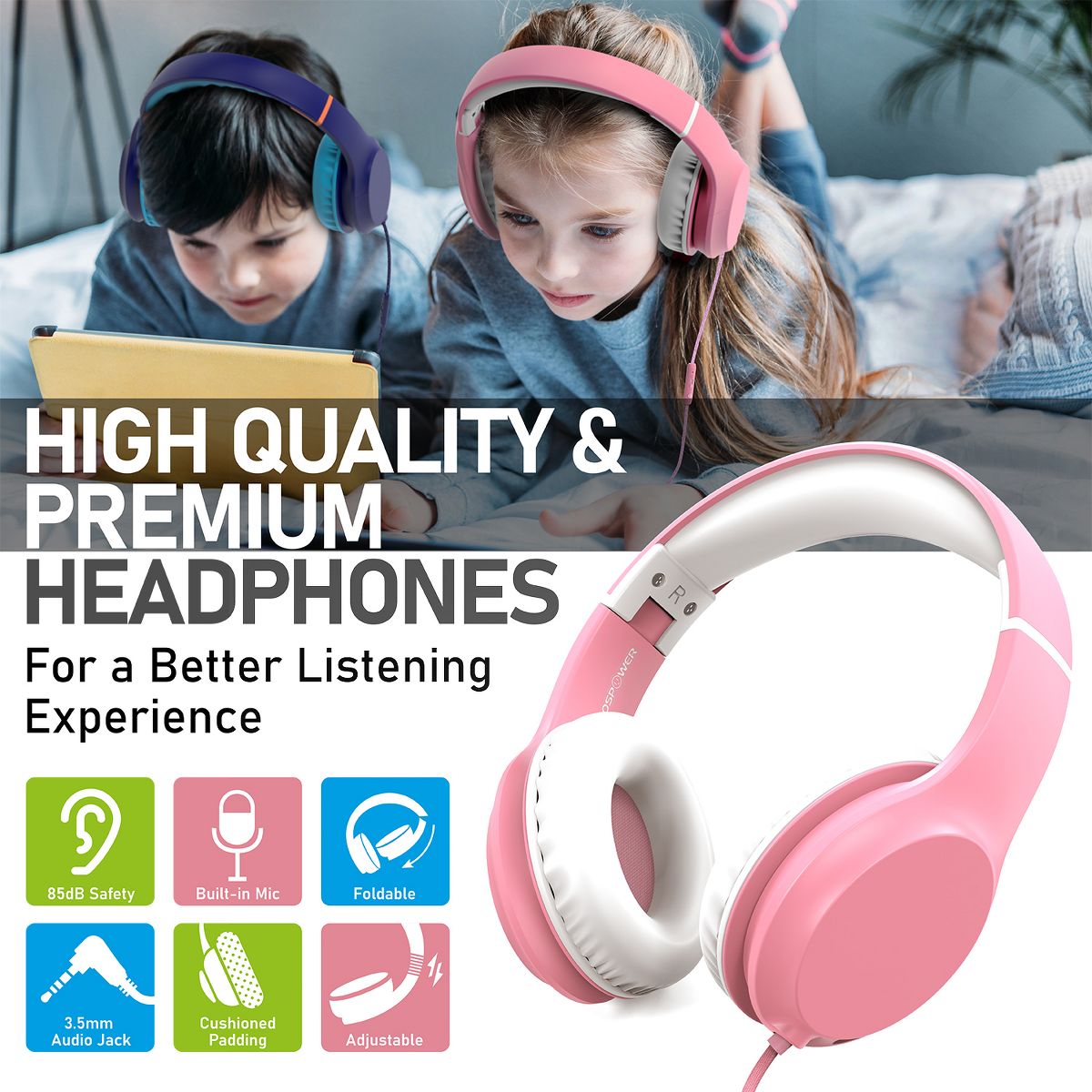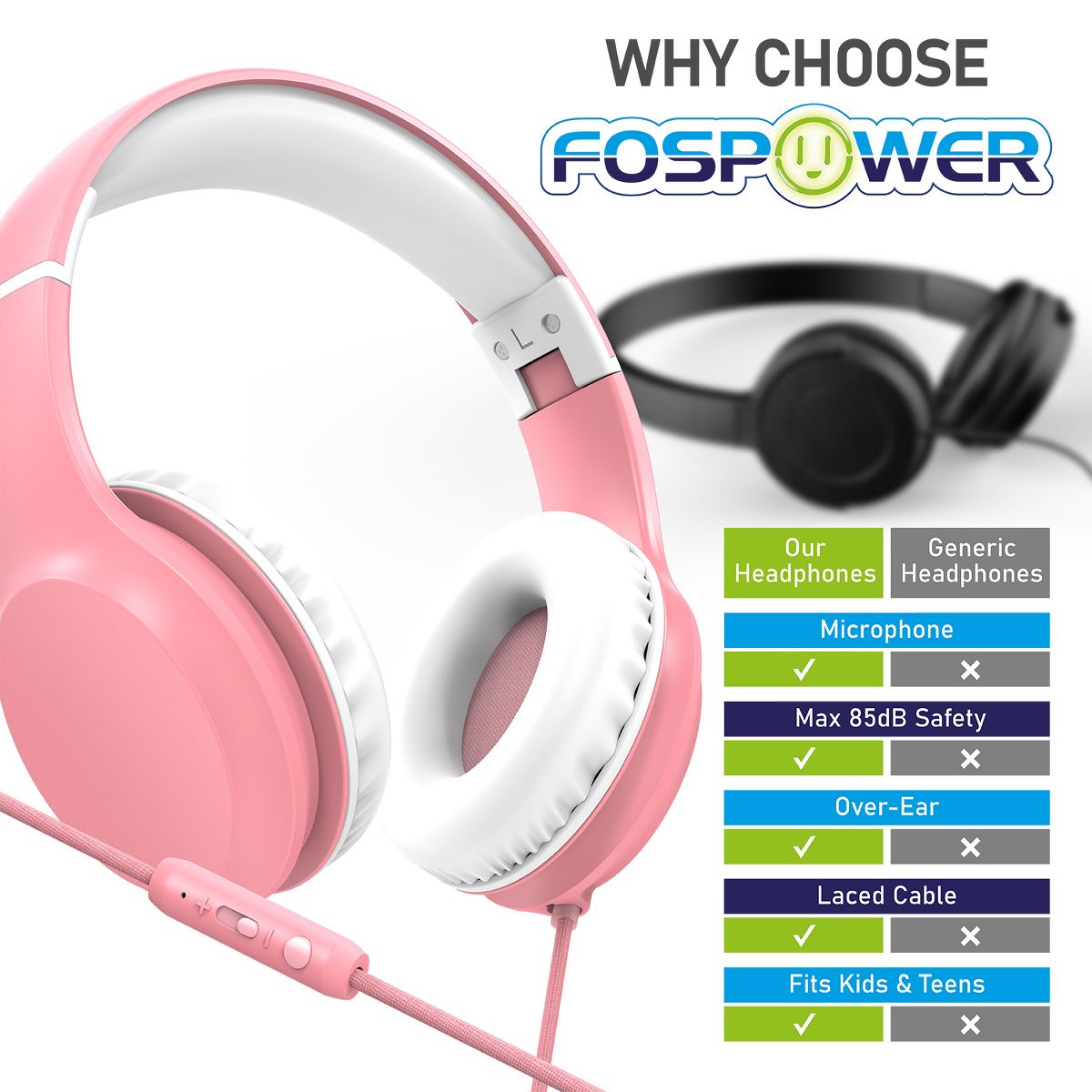 FosPower Kids Headphones Wired Microphone, Over Ear Headphones for Kids with Cord, Kids Headset with 3.5mm Jack For School Chromebook iPad, Pink/White