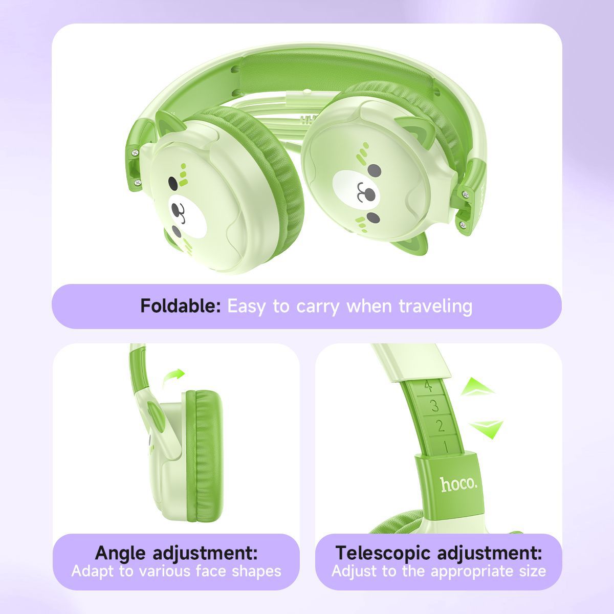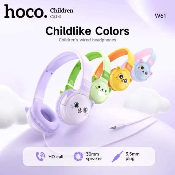 Designed with little listeners in mind, the hoco Kids Wired Headphones prioritize safety, comfort, and ease of use. Soft, cushioned earcups gently conform to children's ears for a snug, comfortable fit, even during extended wear. The exterior features playful animal designs and comes in a variety of vibrant colors, making them a fun and stylish choice for young music lovers. Whether for school, travel, or playtime, these headphones deliver joyful sound in a kid-approved package.