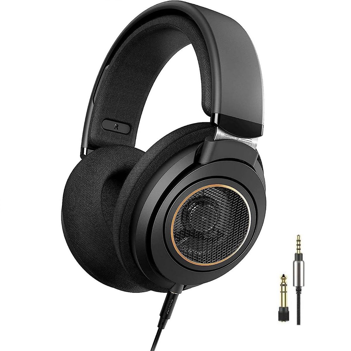 Philips open-back headphones are the perfect blend of performance, comfort, and quality. The open-back design provides spacious sound, ideal for listening to your favorite music every day at home. Perfectly tuned 50 mm drivers deliver crisp bass, balanced mid-range, and pristine high frequencies. The wireless headphones feature drivers engineered to fit the ear's natural geometry to ensure that you hear every detail. The over-ear headphones offer superb comfort, resting lightly on the head for hours of wear. Phillips reinforces the headband with durable steel, which adds just the right amount of tension for a secure fit. Double-layered headband cushioning makes for comfortable headphones, and the breathable ear-cup cushions are perfect for long listening sessions. Connect to any source, from your Smart Device and home setup to Podcasts, TV, and computer with 50 mm headphone amp, with the included 3.5mm gold-plated jacks on the 3-meter detachable cable, which comes with a 1/4 inch to 3.5mm adapter. These neodymium headphones feature an open acoustic system, 32 Ohm impedance, 200 MW maximum power input, 101 dB sensitivity, 12 - 35,000 Hz frequency response, and communication technology.