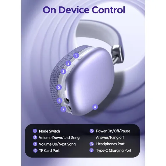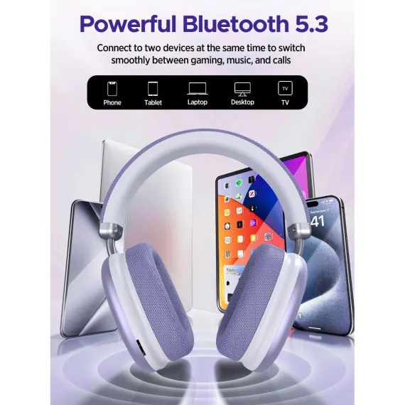 SY-BT1632 Purple Over-Ear Bluetooth Headphones: 40mm Bass Driver, Bluetooth 5.3 Dual-Mode, 40hr Battery, Comfort Fit