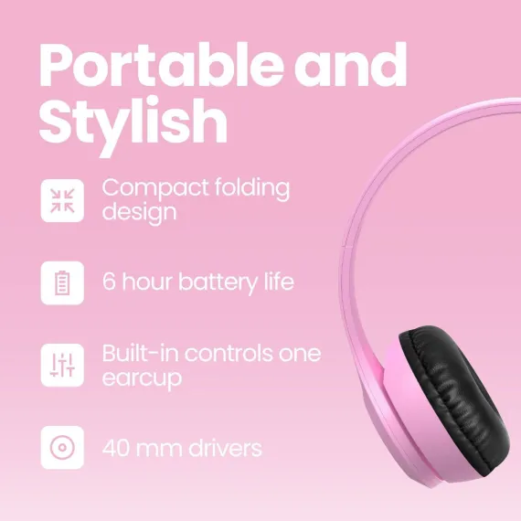 Experience premium sound on the go with the GEMS Over the Ear Wireless Headphones! With an impressive 6-hour battery life, you can enjoy music, podcasts, or calls without interruption. The folding compact design makes them easy to store and carry, while the built-in buttons on the earcup allow for easy media control. Powered by 40mm drivers, these headphones deliver clear audio and the included micro USB charging cable makes recharging simple.