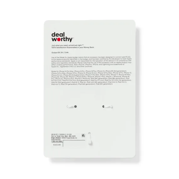 Charge your devices quickly with the 3' Lightning to USB-A Cable - dealworthy™ White. Compatible with iPhone 14 and older models and select iPads, this cable features a male-to-male connection, ensuring flexibility for convenient charging and syncing of your devices. Backed by a 1-year limited warranty, this cable from dealworthy™ makes it the ideal choice for all your charging requirements.