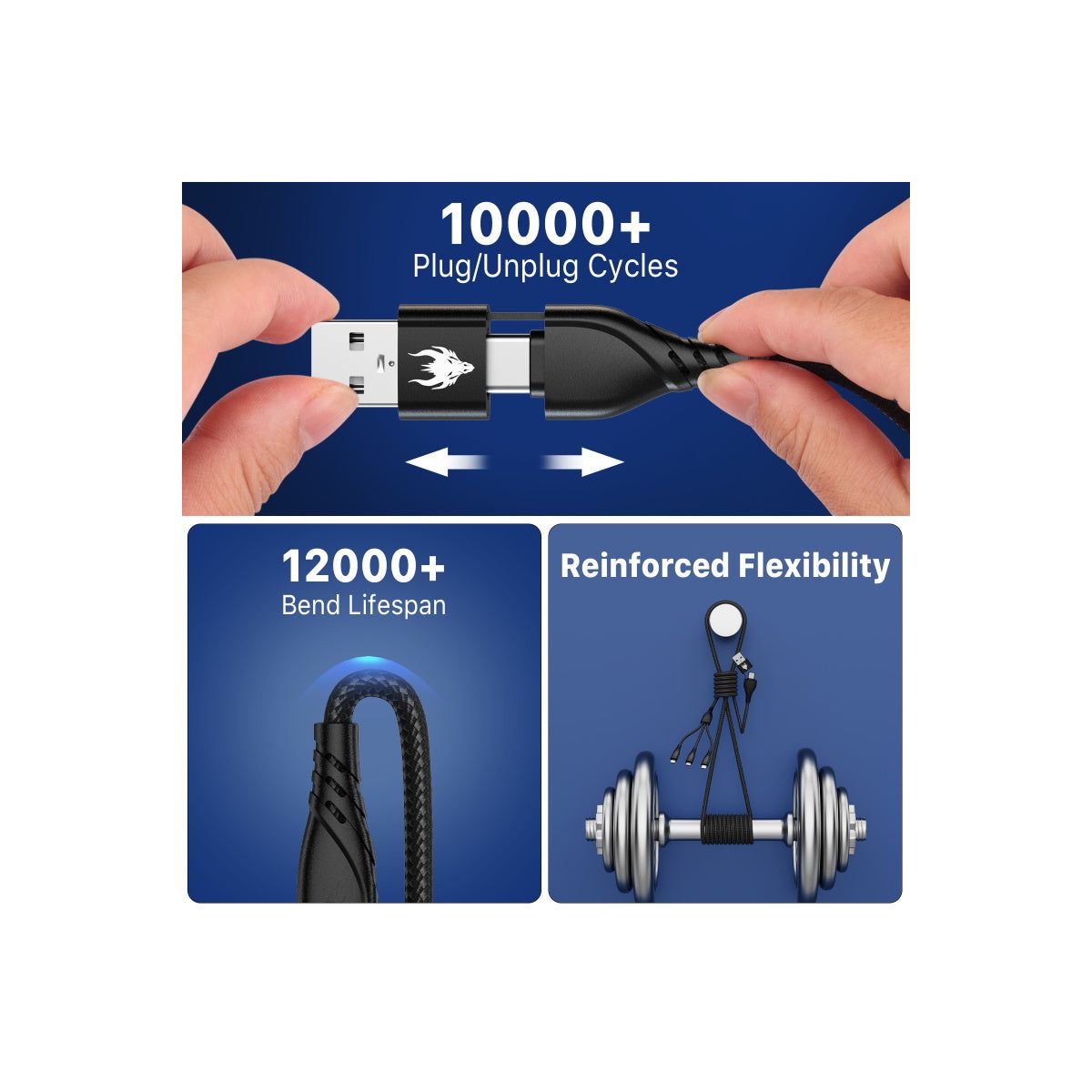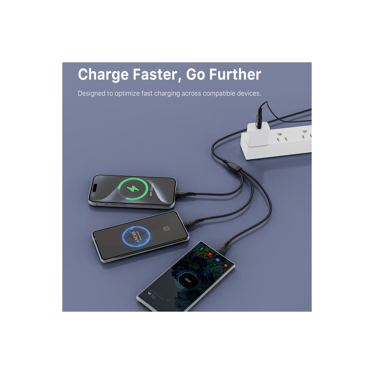 One cable, total power. The AmpNergy PowerLines 5-in-1 Universal Charging Cable delivers fast, efficient charging with a universal design made for everyday use. Featuring USB-C, USB-A, Lightning, and Micro USB connectors, it charges smartphones, tablets, gaming controllers, laptops, and more without the need for multiple cables. The 4FT length offers the perfect balance between convenience and portability, making it ideal for home, office, and travel. Smart Chip Technology provides safe, optimized power delivery, while the braided exterior withstands 12,000+ bends and 10,000+ plug/unplug cycles for superior durability. Compact and versatile, this is the essential charging solution for any setup.