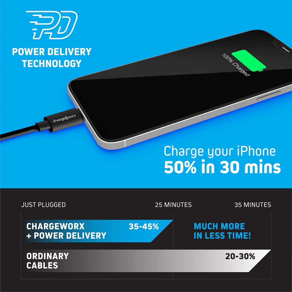 Charge and sync up to 50% faster with ChargeWorx. This 10' cable is capable of transmitting up to 20W of power when combined with a Power Delivery charger for fast charging of iPhones, AirPods, iPads, and more.1
