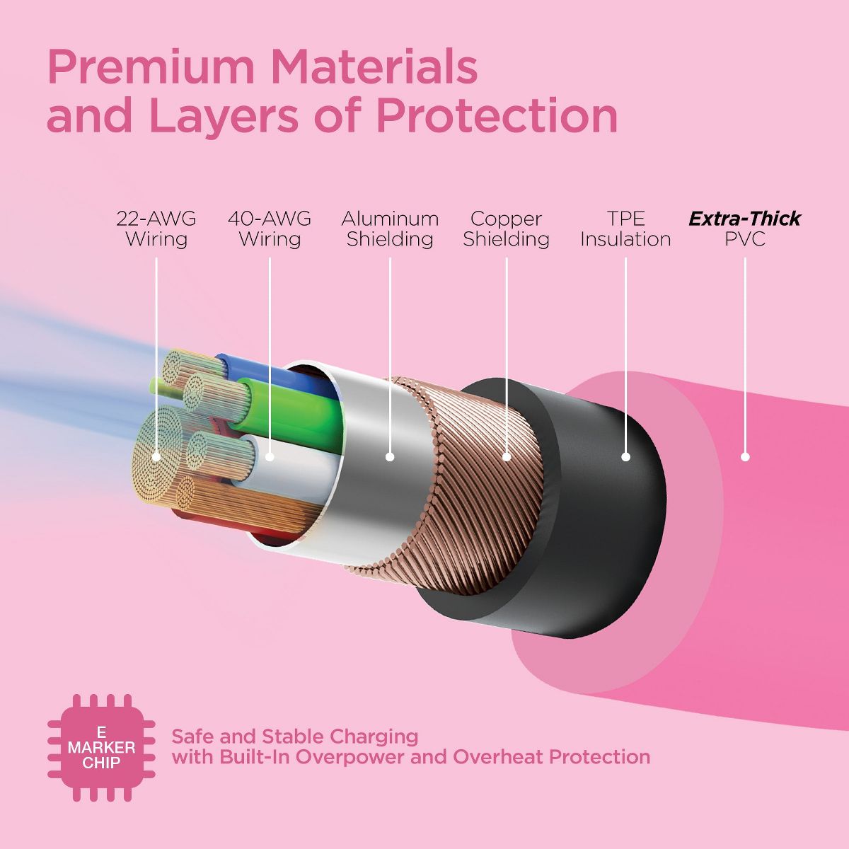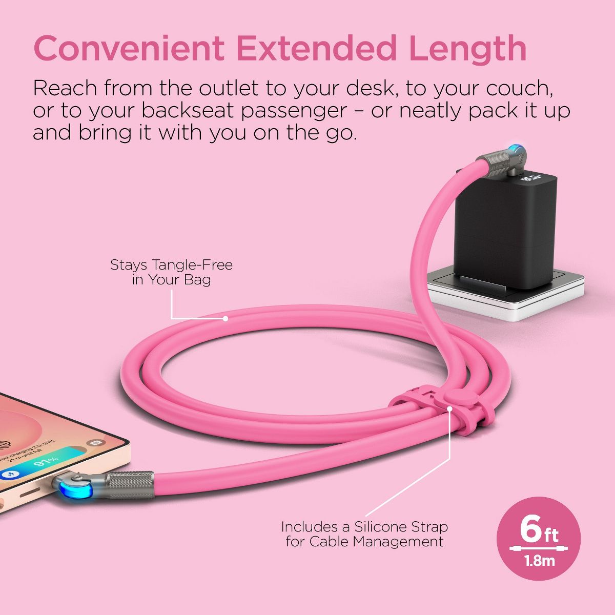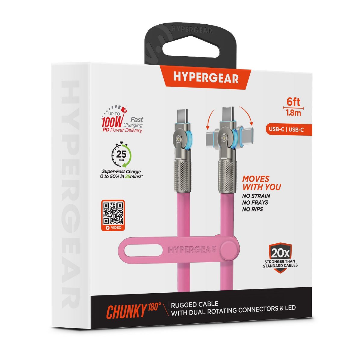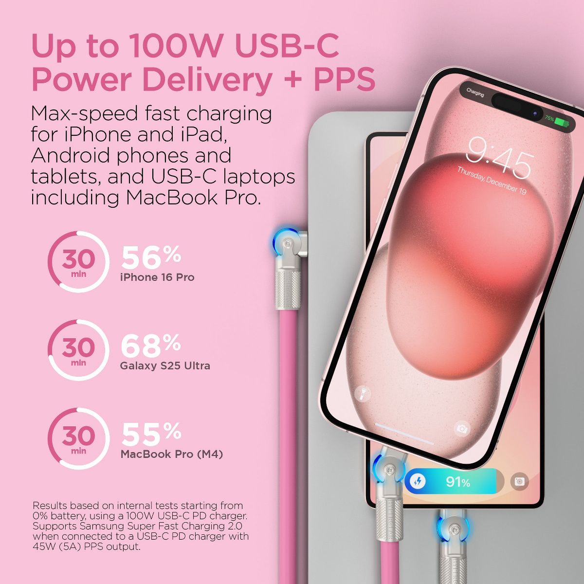 Extra-thick. Made to flex. Built to last. 2X thicker and 20X stronger than standard cables, our Chunky180° cables deliver reliable high-power fast charging performance with no strain, no frays, and no rips. Both USB-C connectors feature 180° rotating swivel tips, putting less strain on your charging ports as the cable moves with you – and giving you a comfortable right-angle grip for gaming and watching videos on your phone. With support for up to 100W USB-C Power Delivery output, you get max-speed fast charging for iPhone and iPad, Android phones and tablets, and USB-C laptops including MacBook Pro.