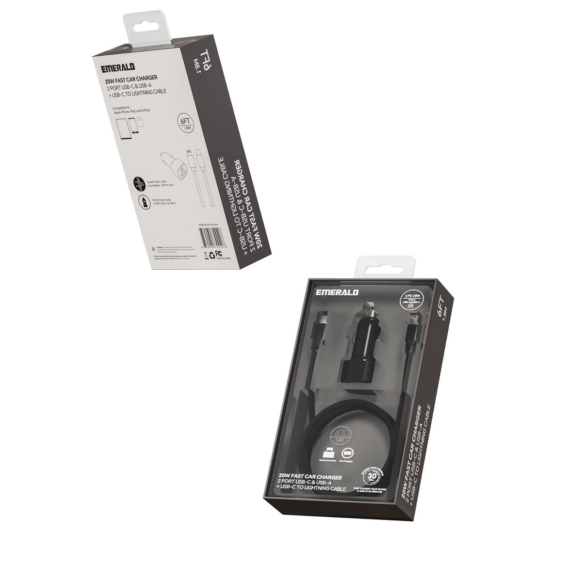 Emerald 2 Port Car Adapter + 6FT Lightning Cable - Black Charger for iPhone