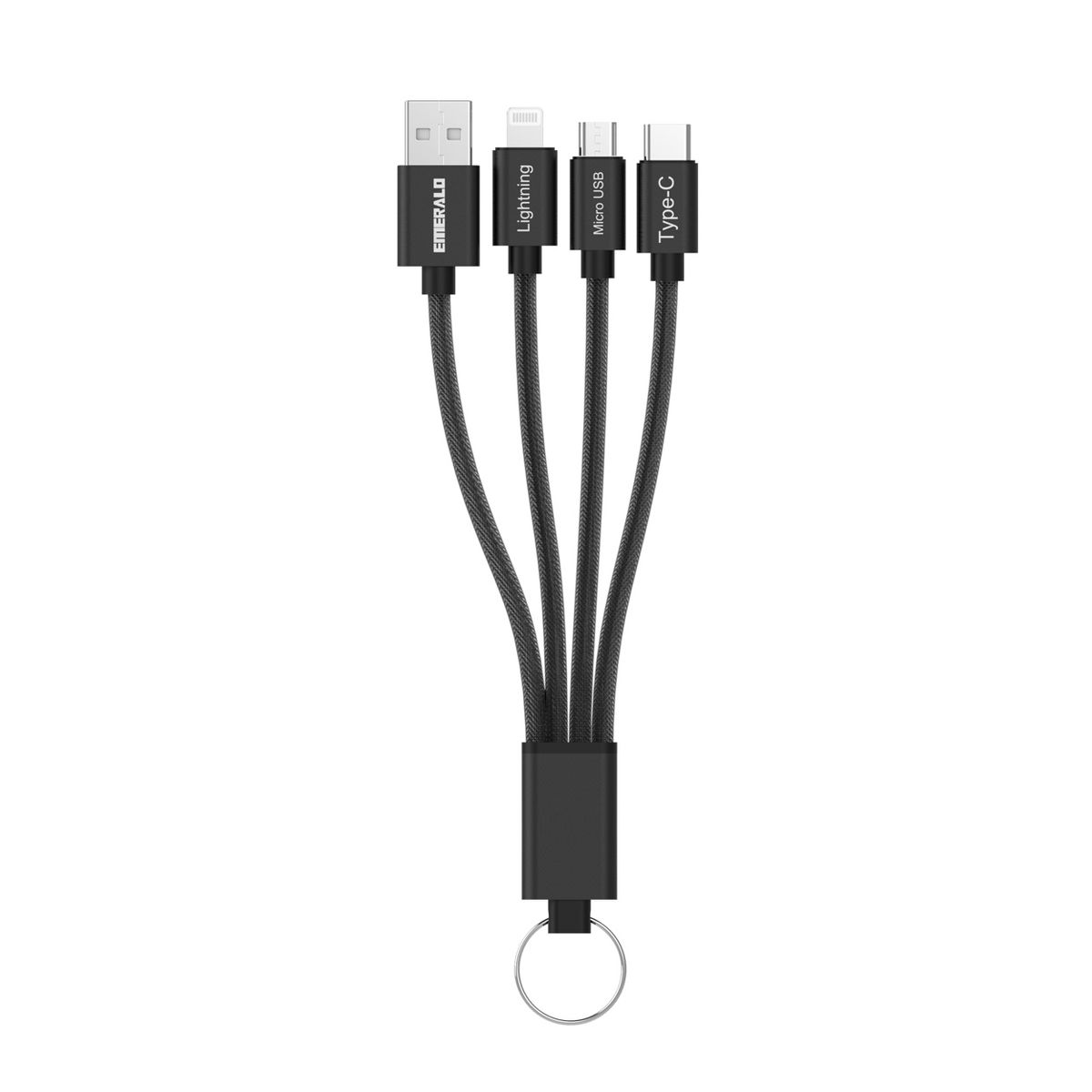 Emerald 3-in-1 Braided Keychain Design USB-A to Lightning, Type-C & Micro USB Fast Charging & Data Syncing Cable - Black