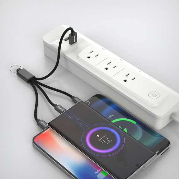 Stay powered up wherever you go with this compact and durable 3-in-1 Keychain Charging Cable. Built with a strong braided design for long life under heavy use, this versatile cable is designed to keep all your devices charged and ready. Featuring USB-A to Lightning, USB-C (Type-C), and Micro USB connectors, it eliminates the need for carrying multiple cables.